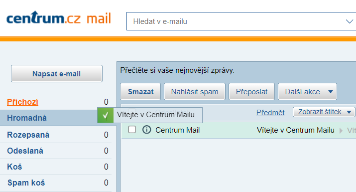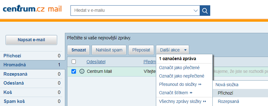 Ve schránce Centrumu vám potvrzení vaší objednávky mohlo přijít v bočním menu do složky „Hromadná“ nebo do složky „Spam koš“. Pokud v příslušné složce e-mail najdete, stačí: