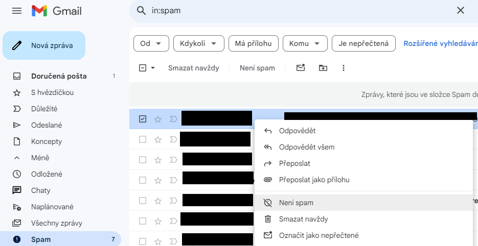 C) na příchozí e-mail stačí najet myší, zakliknout levým tlačítkem myši checkbox (malý čtvereček), kliknout na pravé tlačítko myši, zobrazí se nabídka možností, z té kliknout na možnost „Není spam“. Následně vám dole vyskočí upozornění „U konverzace bylo zrušeno označení spam a byla přesunuta do doručené pošty.“. Od této chvíle vám budou všechna potvrzení objednávky klasicky chodit do doručené pošty.