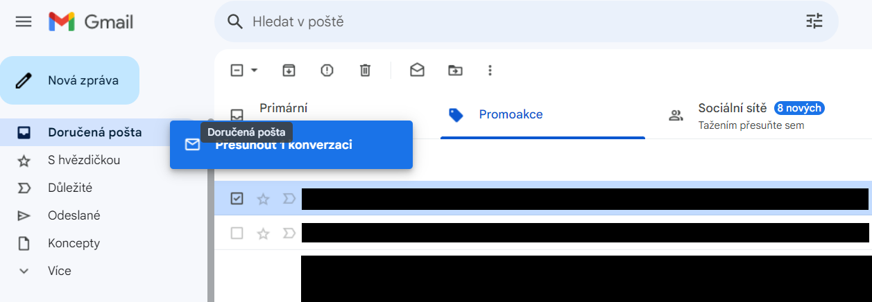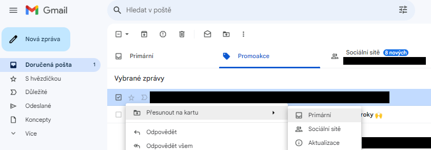 Ve schránce Gmailu vám potvrzení vaší objednávky mohlo přijít v horních záložkách do složky „Promoakce“ nebo do složky „Sociální sítě“. Pokud v příslušné složce e-mail najdete, stačí:
