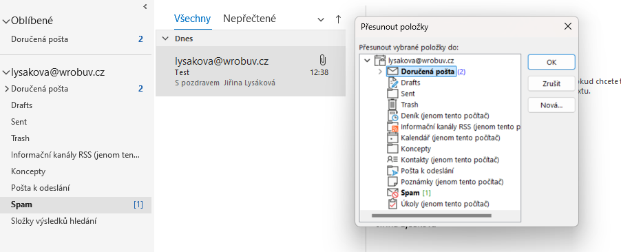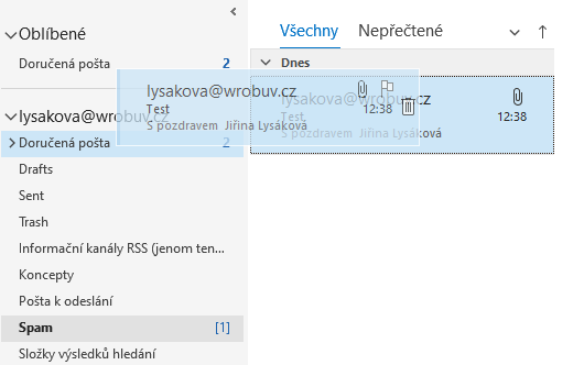 A) na příchozí e-mail najet myší, stisknout levé tlačítko a držet jej, v tento okamžik uchopíte e-mail a nyní jej stačí jen přetáhnout tahem myší do složky „Doručená“.