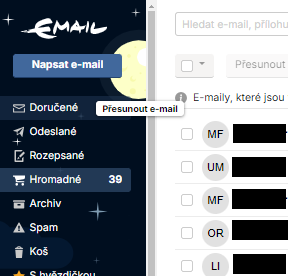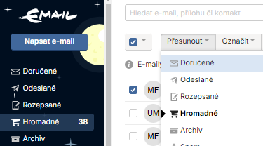 B) na příchozí e-mail najet myší, zakliknout levým tlačítkem myši checkbox (malý čtvereček), potom můžete v horní nabídce kliknout na „Přesunout do“, kliknutím se zobrazí nabídka možností, ve které zvolíte „Doručená“.