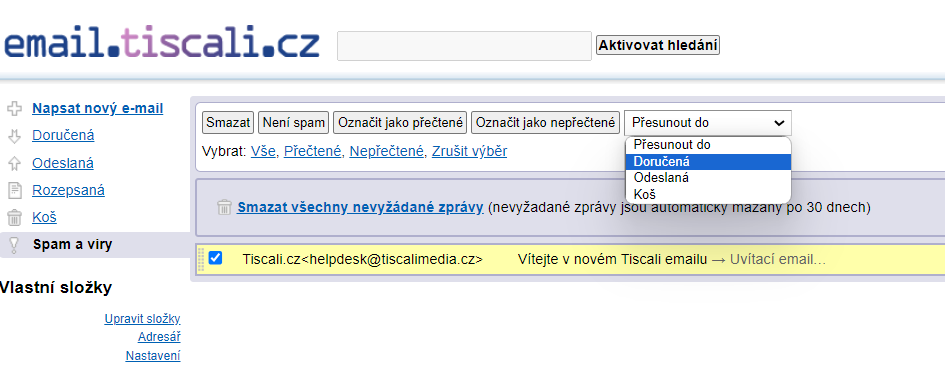 Ve schránce Tiscali vám potvrzení vaší objednávky mohlo přijít v bočním menu do složky „Spam a viry“. Pokud v příslušné složce e-mail najdete, stačí: