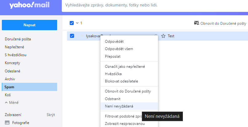 Ve schránce Yahoo vám potvrzení vaší objednávky mohlo přijít v bočním menu do složky „Spam“. Pokud v příslušné složce e-mail najdete, stačí:
