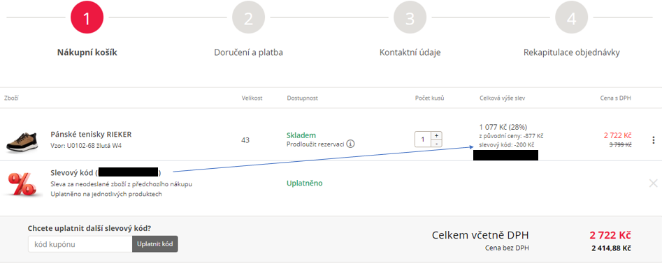 Kód, který obdržíte stačí pouze zkopírovat do pole „Kód kupónu“ a kliknout na „Uplatnit kód“. Sleva se vám automaticky promítne v košíku viz obrázek níže.