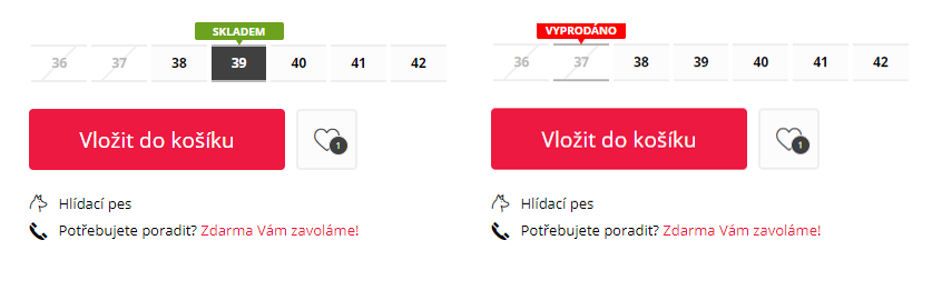 Zároveň pokud na dané číslo velikosti kliknete, zobrazí se „SKLADEM“, nebo „POSLEDNÍ KUS“ či „VYPRODÁNO“.