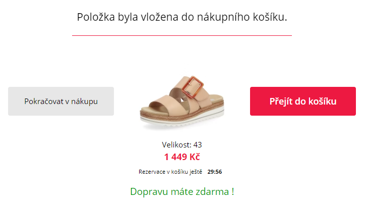 Ano. V případě, že si produkt vložíte do košíku, bude pro vás 30 minut rezervovaný. Díky tomu vám zaručíme, že konkrétní velikost obuvi nebo danou barvu a velikost doplňku vám nikdo jiný nevykoupí.