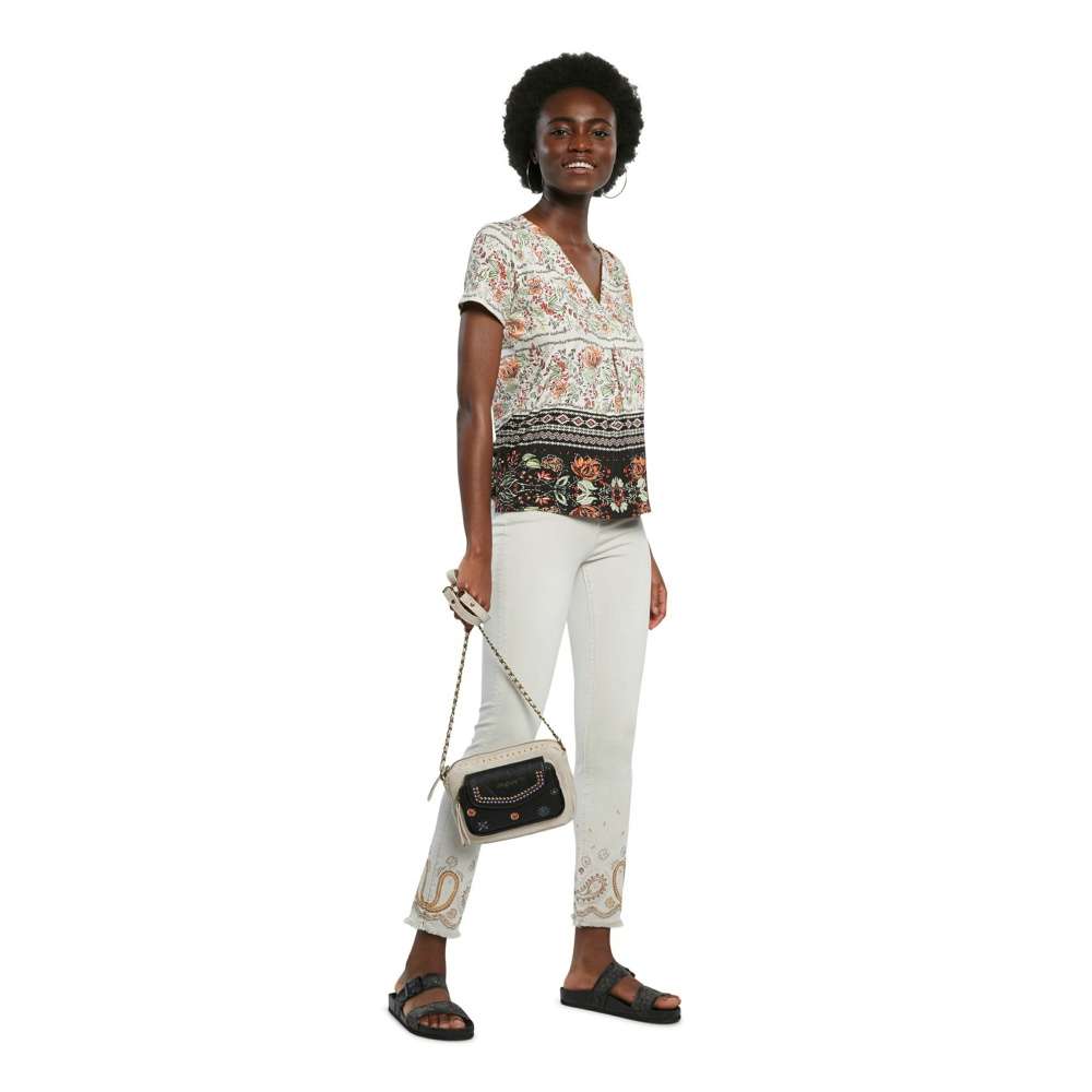 Extravagantní Crossbody model od značky Desigual je tvořen syntetickým svrškem s kombinací vzorů v černo-hnědém provedení a je doplněn o přední kapsu s výšivkami, která se uzavirá klopou.