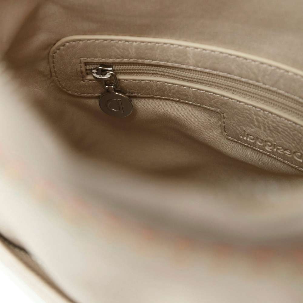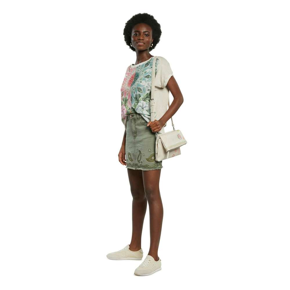 Dámská kabelka v oblíbeném stylu Crossbody má svršek v béžové barvě, který je dozdoben několika vyšitými ornamenty.