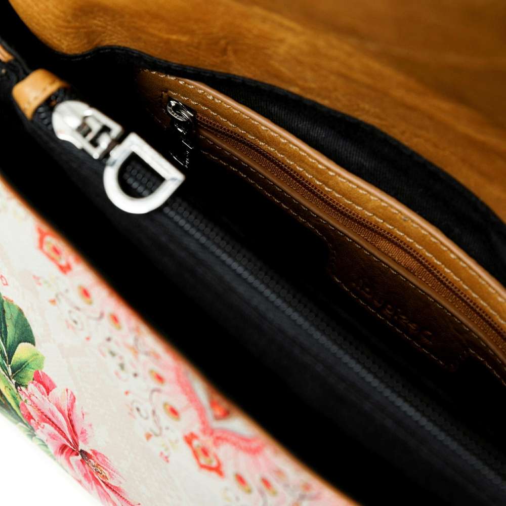 Kabelka má víceúčelovou klopu, kdy slouží jako samostatná kapsa na zip a jako uzávěr hlavního prostoru poslouží její magnetické klipy. Vnitřní část s nápaditou podšívkou je rozdělena kapsou na zip, kde si můžete uschovat Vaše drobnosti.