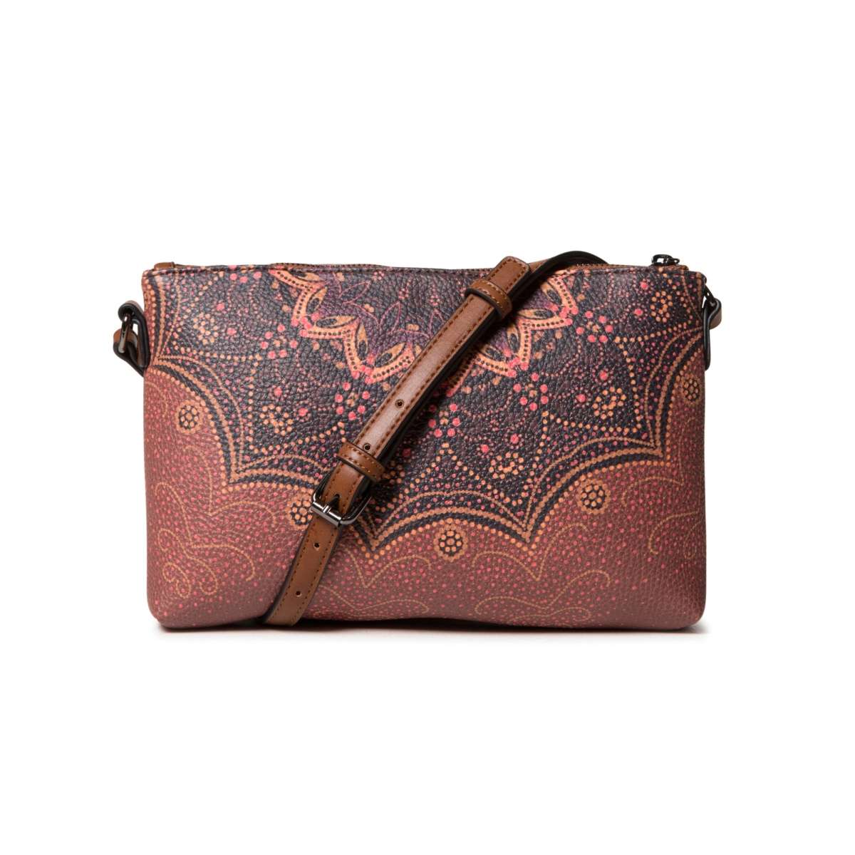 Tento originální a stylový kousek od značky Desigual hnědé barvy Vás oslní svými výraznými ornamenty s decentními kovovými aplikacemi. Na přední straně naleznete praktickou kapsu, do které si můžete uložit Vaše drobnosti.