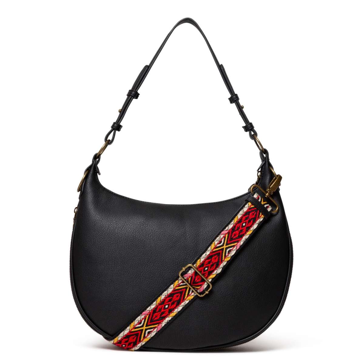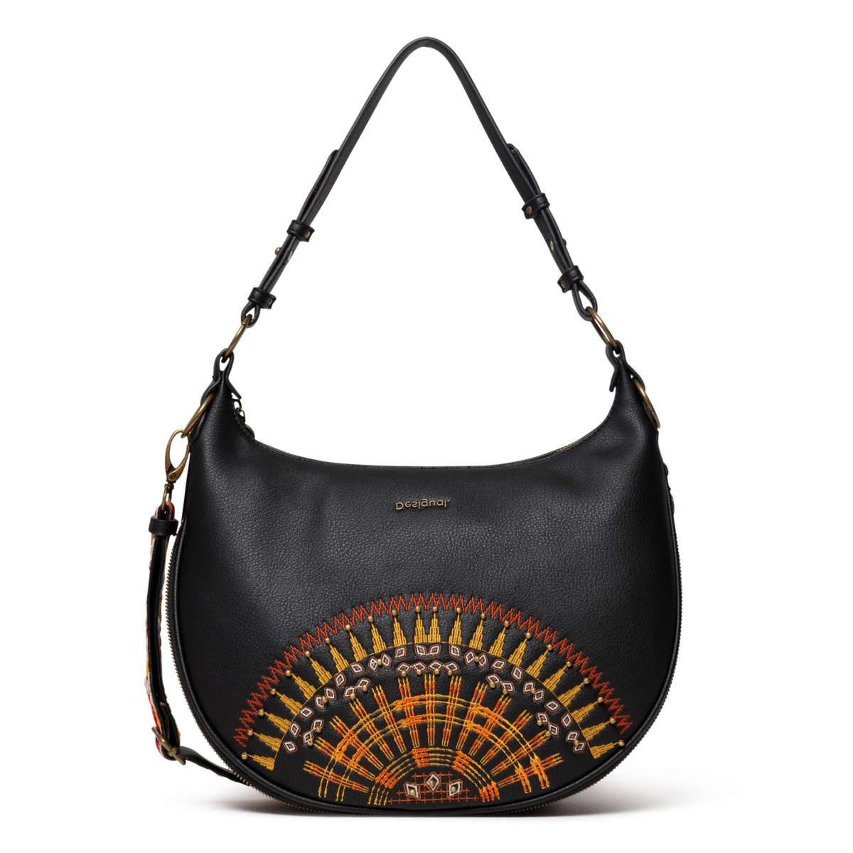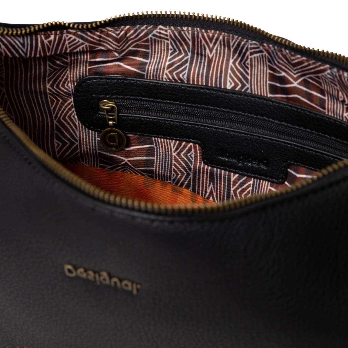 Originální černá kabelka od značky Desigual se zdobným ornamentem na přední straně a podélným zipem, díky kterému lze zvětšit její objem.