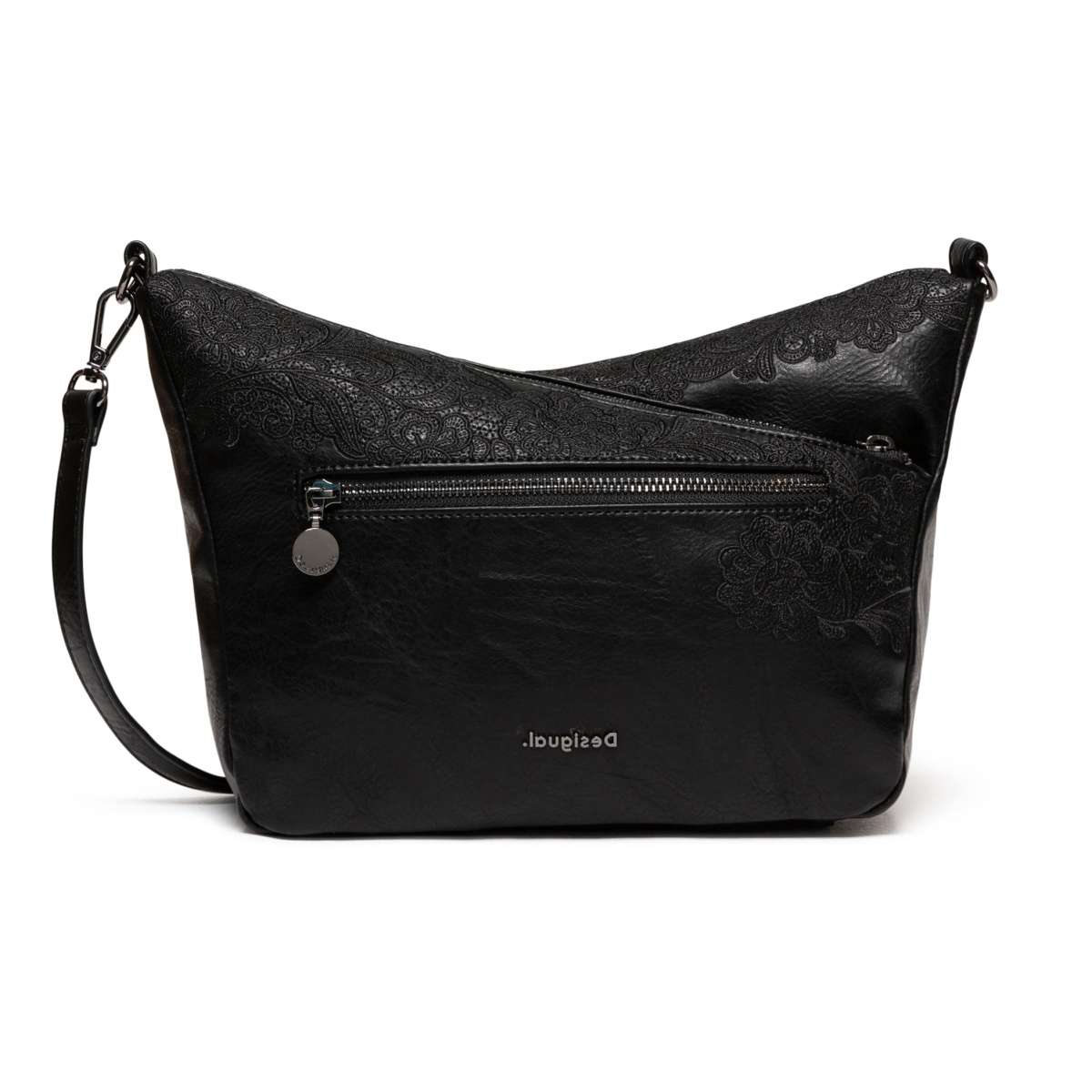 Zajímavě řešená Crossbody kabelka Desigual se cvočky a decentními výšivkami v černé barvě.