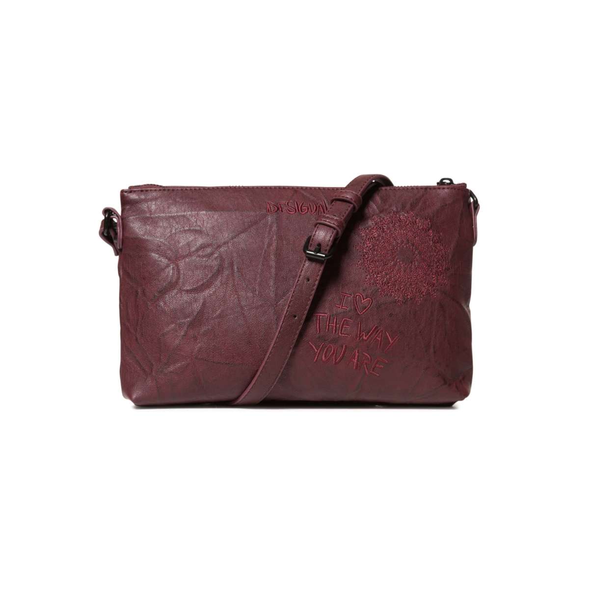 Jednoduchou ale zároveň elegantní kabelku značky Desigual ve vínové barvě a stylu Crossbody si díky decentním výšivkám zamilujete už na první pohled. Doplňujícím prvkem svršku tašky je kapsička pro Vaše cennosti.