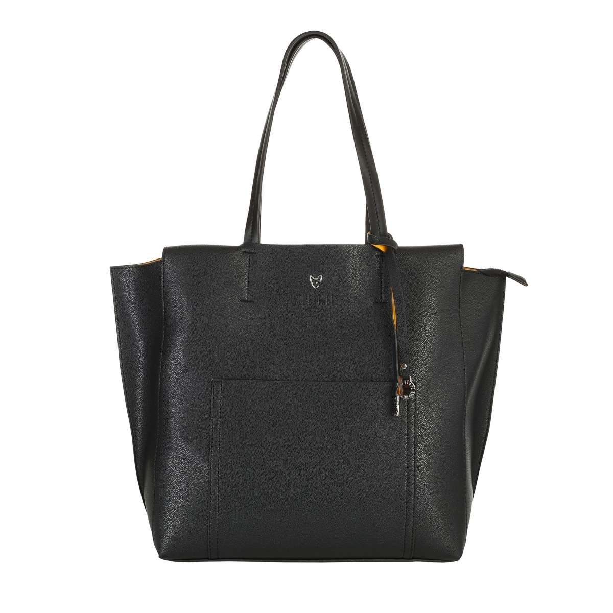 Svršek kabelky je vyroben ze syntetického materiálu černé barvy. Zdobená je znakem firmy i kapsou na drobnosti na přední straně a přívěskem.