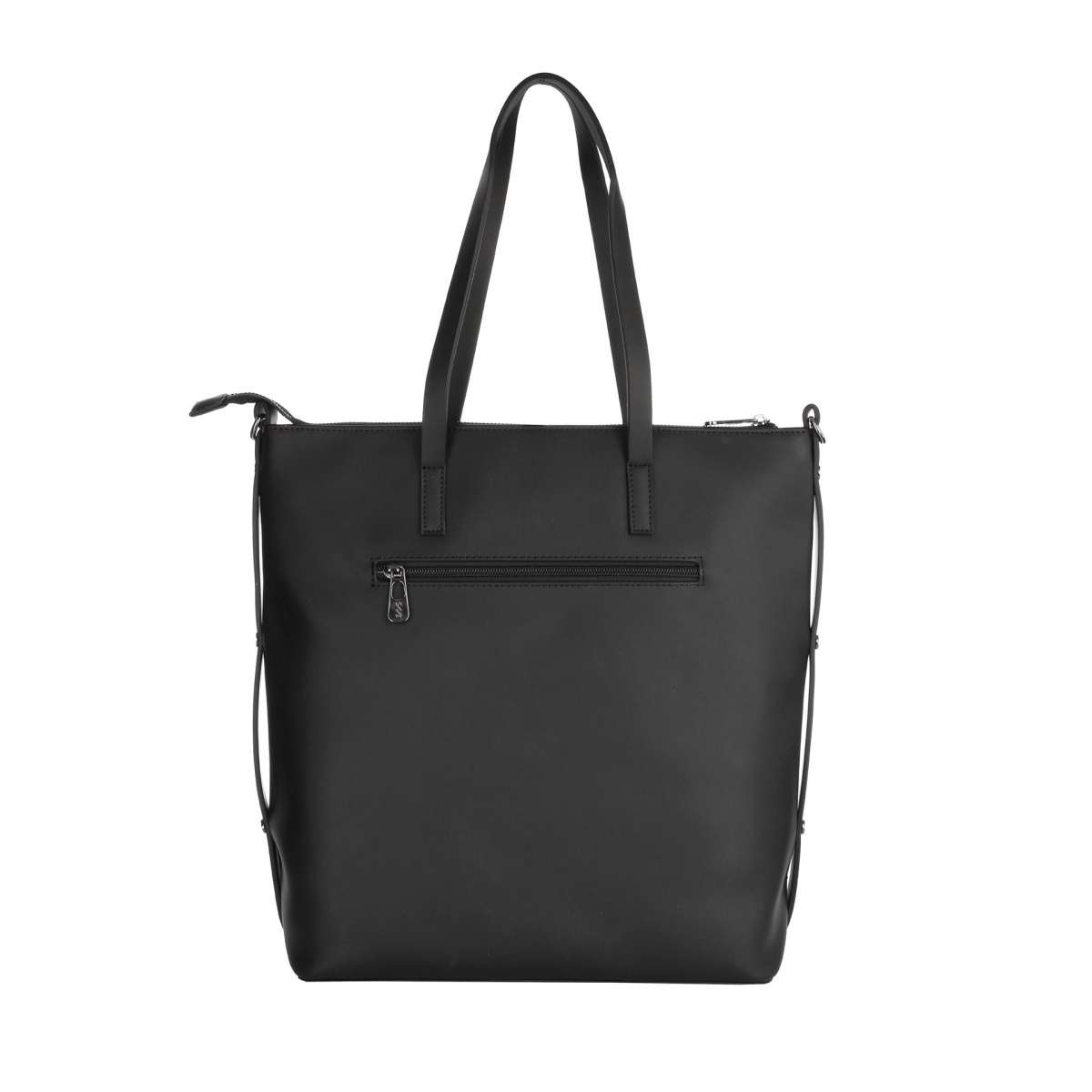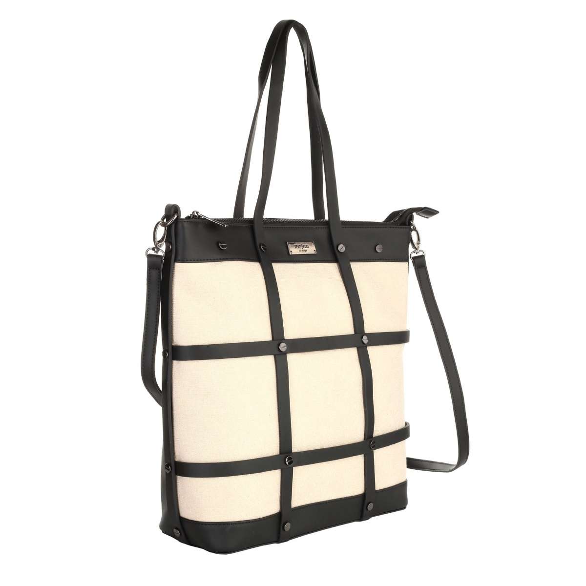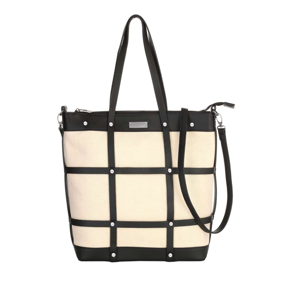 Svršek kabelky je vyroben ze syntetického materiálu zajímavého střihu a černo béžové barvy vyniká jednoduchostí a prostorností. Zdobená je designem přední strany. Dále je taška vybavena kapsou na zadní straně uzavíratelnou na zip.