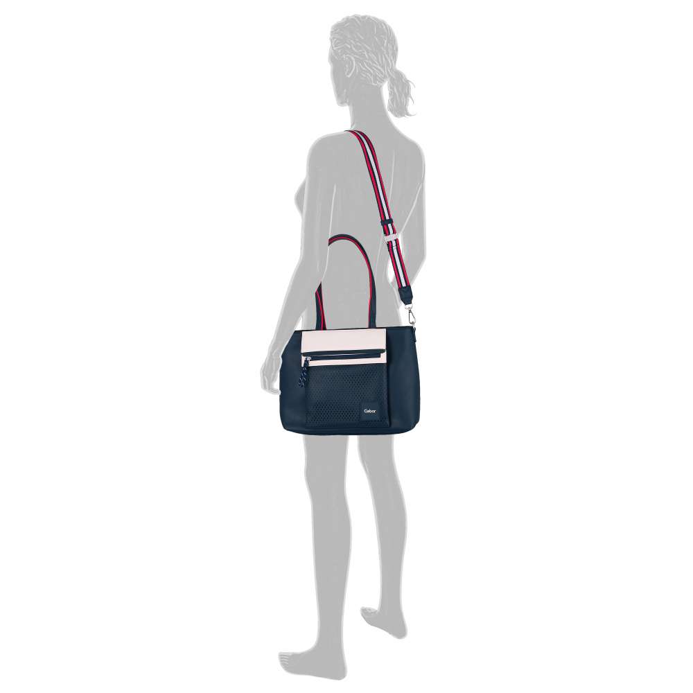 Barevně kombinovaný dámský model s přední částečně perforovanou kapsou a decentním logem značky Gabor. Svrchní materiál je vyroben z hladkého kvalitního materiálu v tmavě modré barvě.