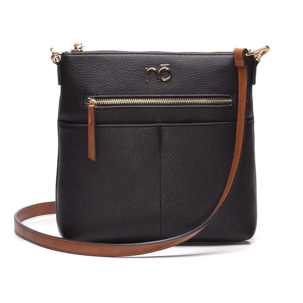 Hladký svršek má na přední straně dvě otevřené přihrádky a jednu na zip. Zdoben je logem značky a odstíny hnědé na zipech a popruhu. Díky černé barvě tento model sladíte s každým outfitem