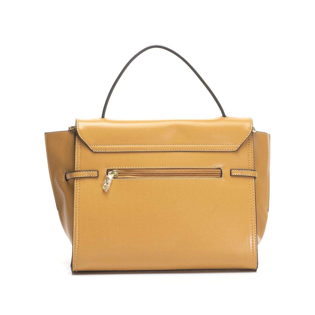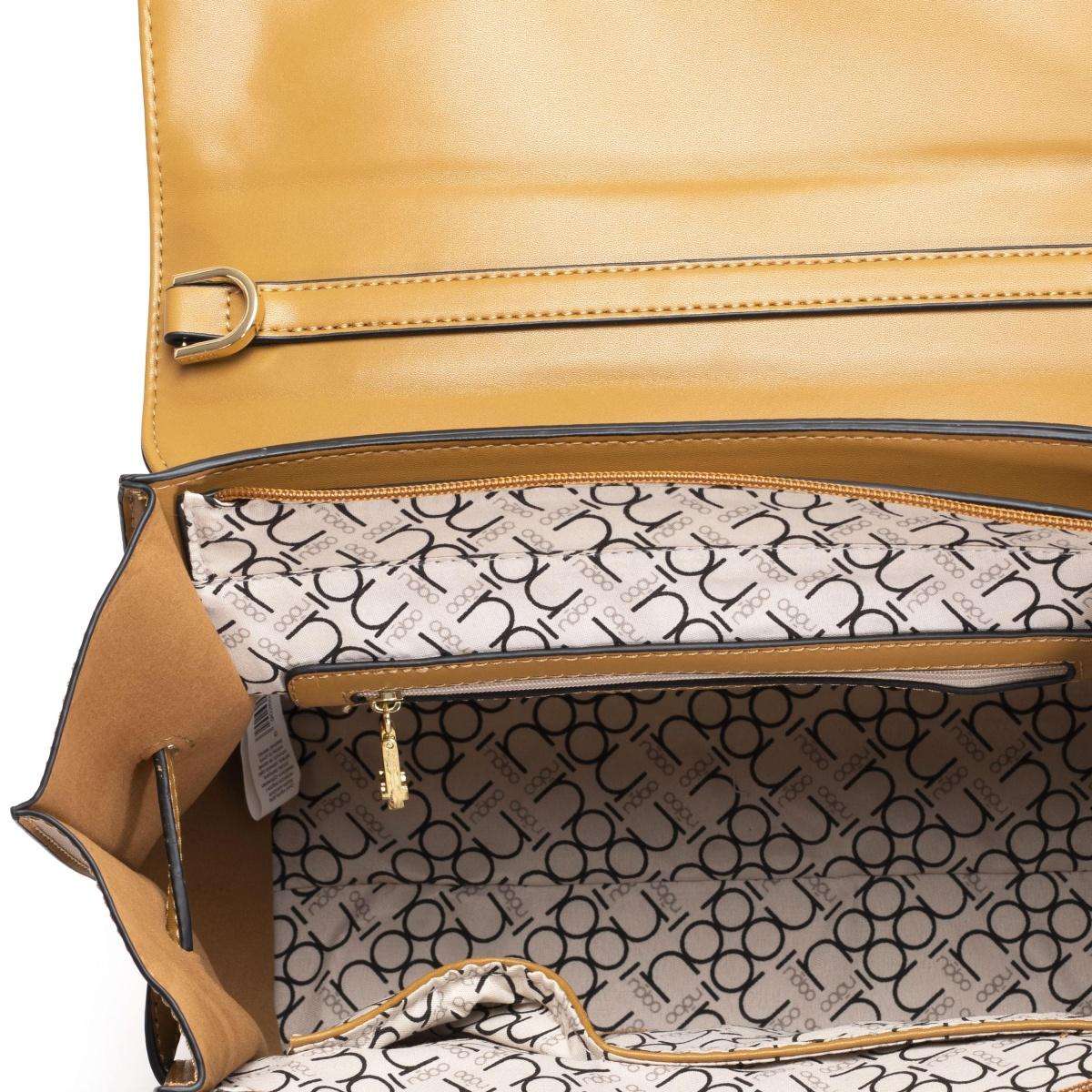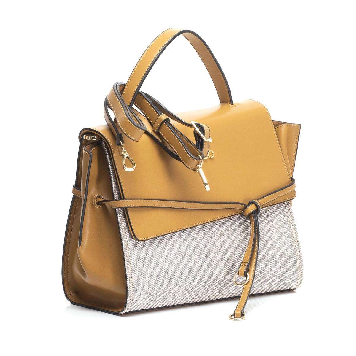 Tato elegantní dámská kabelka od značky Nobo v kombinaci materiálu je originální, díky stahovacímu pásku podél kabelky a klopě se zlatavým logem.