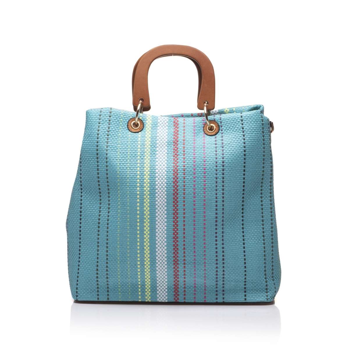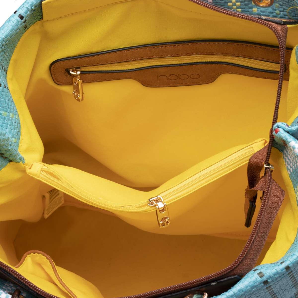 U horního okraje má taška zip, po jehož rozepnutí se otevřou dvě kapsy, kdy jako dělící prvek je použita kapsa se zipem. V jedné části jsou dvě otevřené přihrádky, ve druhé kapsička na zip. Tento model je vybaven odepínatelným popruhem, který si můžete nastavit dle potřeby, ale také uchy v dřevěném vzhledu, takže můžete tašku nosit i jen tak v ruce. Kabelku využijete jak do práce, tak do města.
