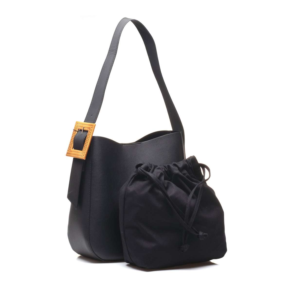 V horní části je zapínání na magnetický klip. Po jeho otevření se ukáže velká kapsa, ve které je textilní vak na stahování šňůrkou, který slouží jako úložný prostor, ale zároveň jej lze vyjmout a použít zvlášť nebo třeba očistit. Taška má široký popruh přes rameno, který lze délkově nastavit díky velké ozdobné sponě na boční straně. Tento model snadno sladíte s každým Vaším outfitem.