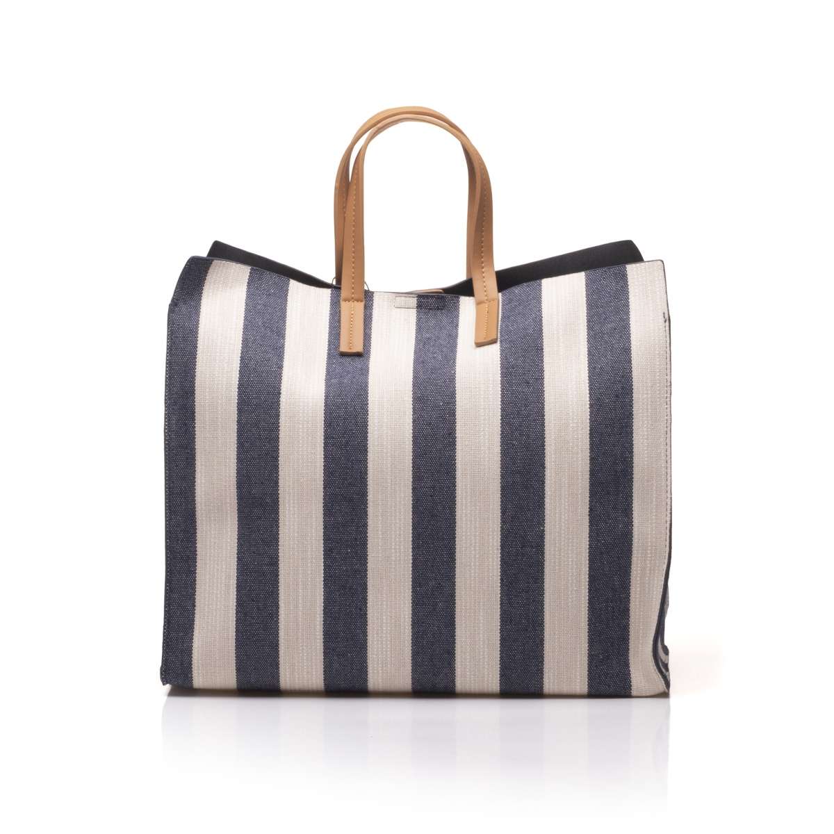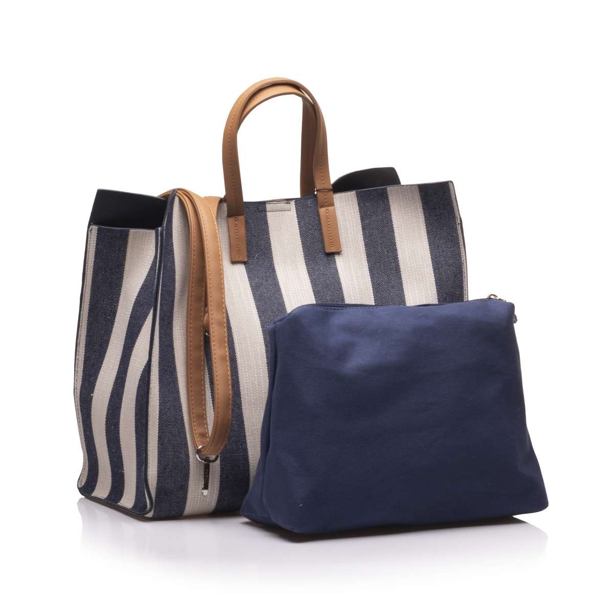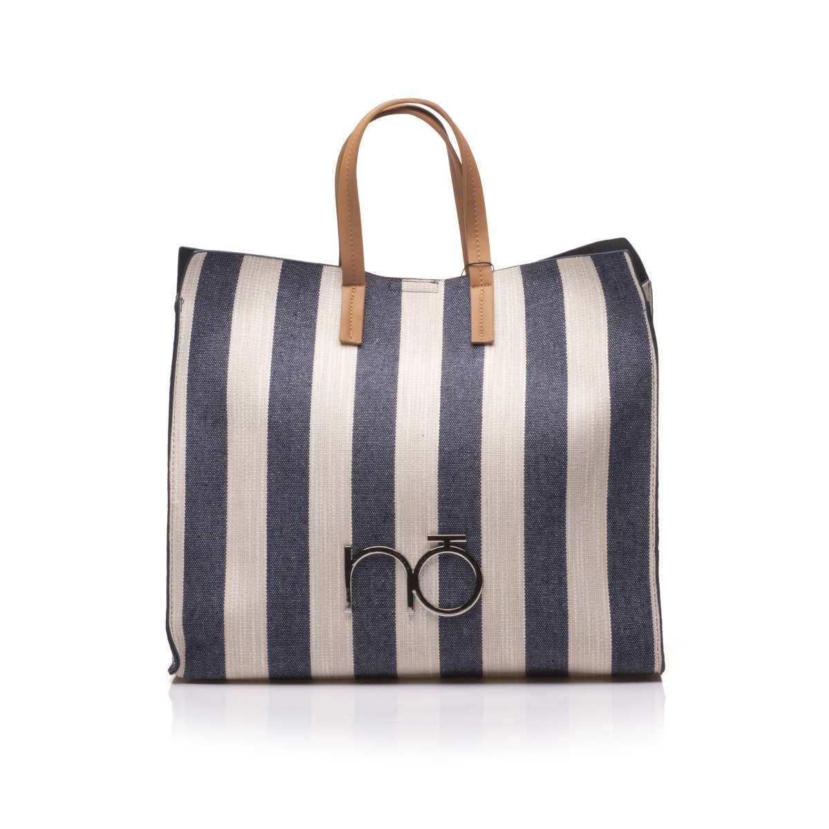 Prostorná pruhovaná kabelka, značky NOBO. Textilní pruhovaný svršek je na přední straně zdoben logem značky. V horní části je zapínání na magnetický klip. Po jeho otevření se ukáže velká kapsa, ve které je vložena menší taška na zip, která slouží jako další kapsa. Lze ji vyjmout a případně využít i zvlášť. Tento model můžete nosit přes rameno pomocí dlouhého odepínatelného popruhu, který si délkově lze nastavit, nebo za krátká ucha jen tak v ruce. Vlastnosti kabelky Výška: cca 31 cm Šířka: cca 36,5 cm Šířka dna : cca 15 cm Materiál svršku: Syntetický materiál Uši: ANO Pásek přes rameno: ANO – dlouhý a délkově nastavitelný Zapínatelná na zip: NE Vnitřní kapsy: NE