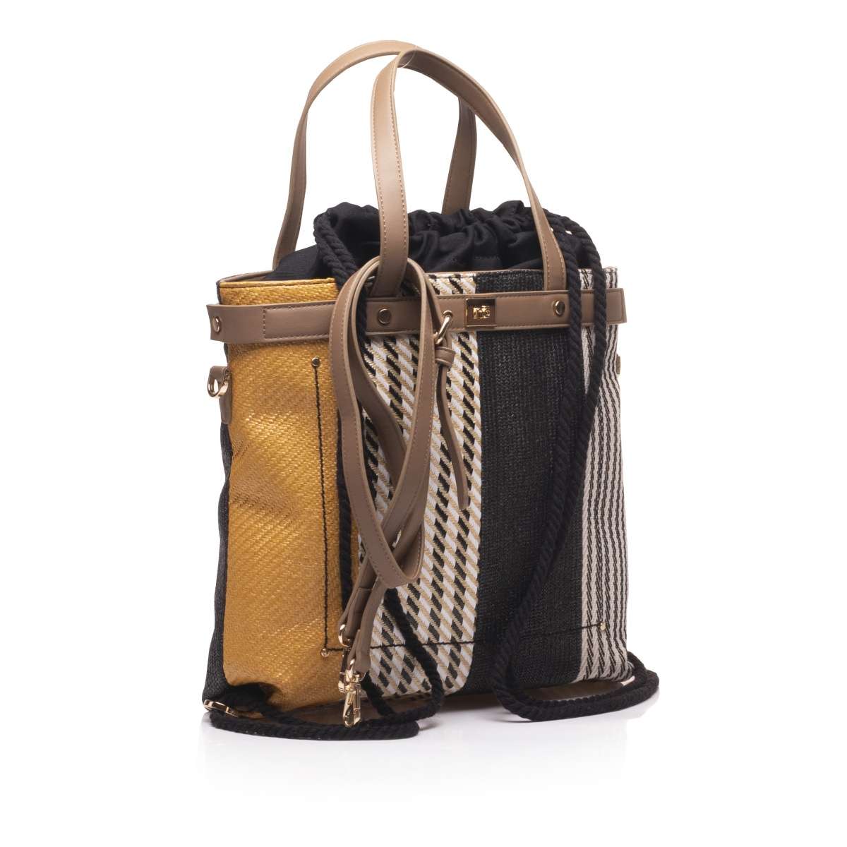U horního okraje má stahování šňůrkami, fungujícími zároveň jako popruhy, se kterými tuto kabelku můžete nosit i na zádech jako batoh. Po rozepnutí se otevře vnitřní kapsa, do které se vejde vše, co potřebujete. Na jedné vnitřní straně má kapsu na zip a na druhé dvě kapsy na drobnosti. Tento model je vybaven odepínatelným popruhem, který si můžete nastavit dle potřeby, ale také uchy, takže můžete tašku nosit i jen tak v ruce. Díky třem možným variantám nošení bude Vaším praktickým ale i zároveň elegantním doplňkem.