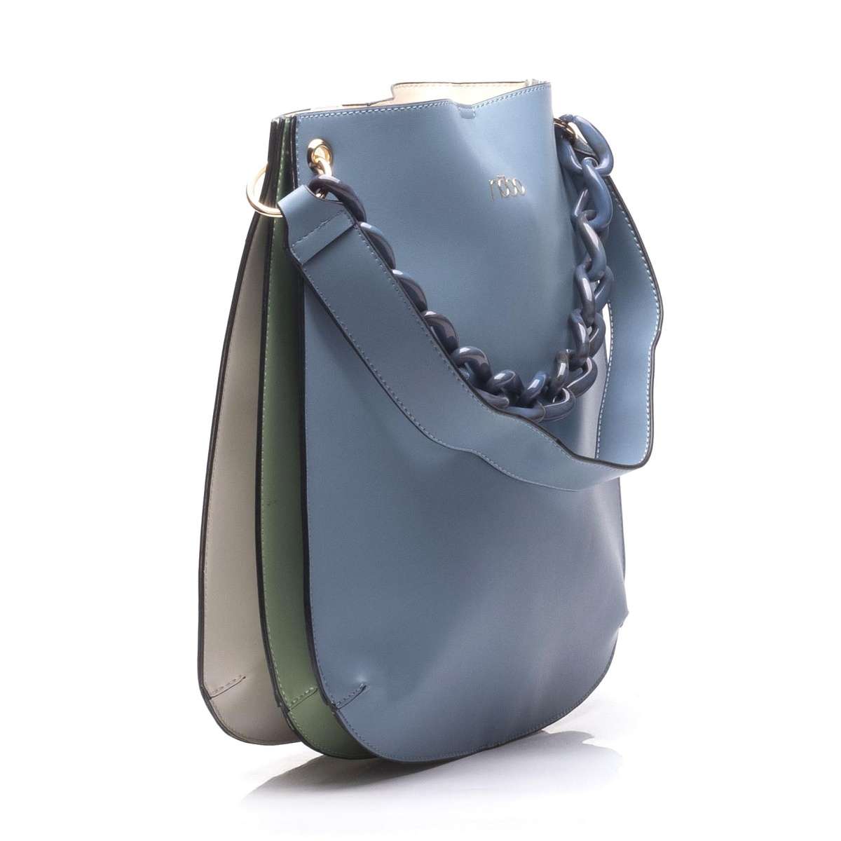 Dámská kabelka značky NOBO je vyrobena v kombinaci několika barev a ozdobena plastovým řetězem. Přední strana je modré barvy, zadní bílé barvy a uvnitř se střídá zelená s béžovou.