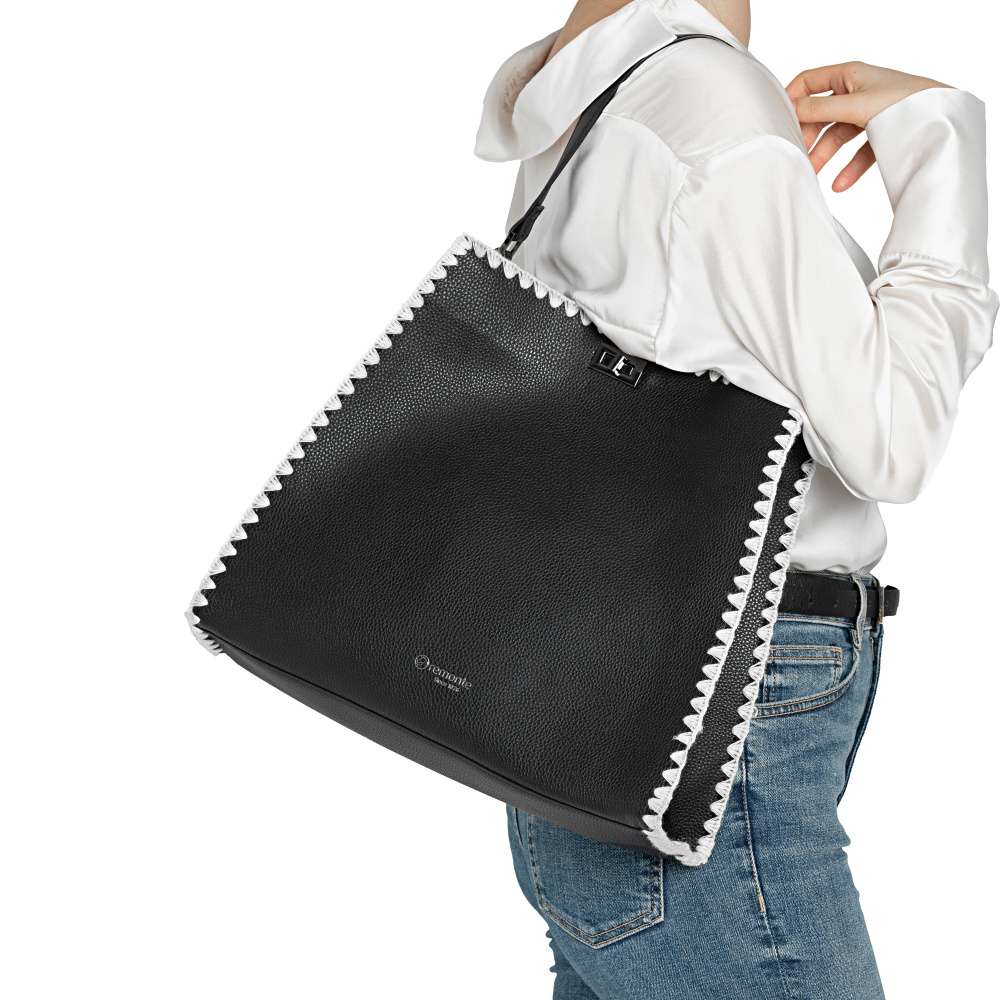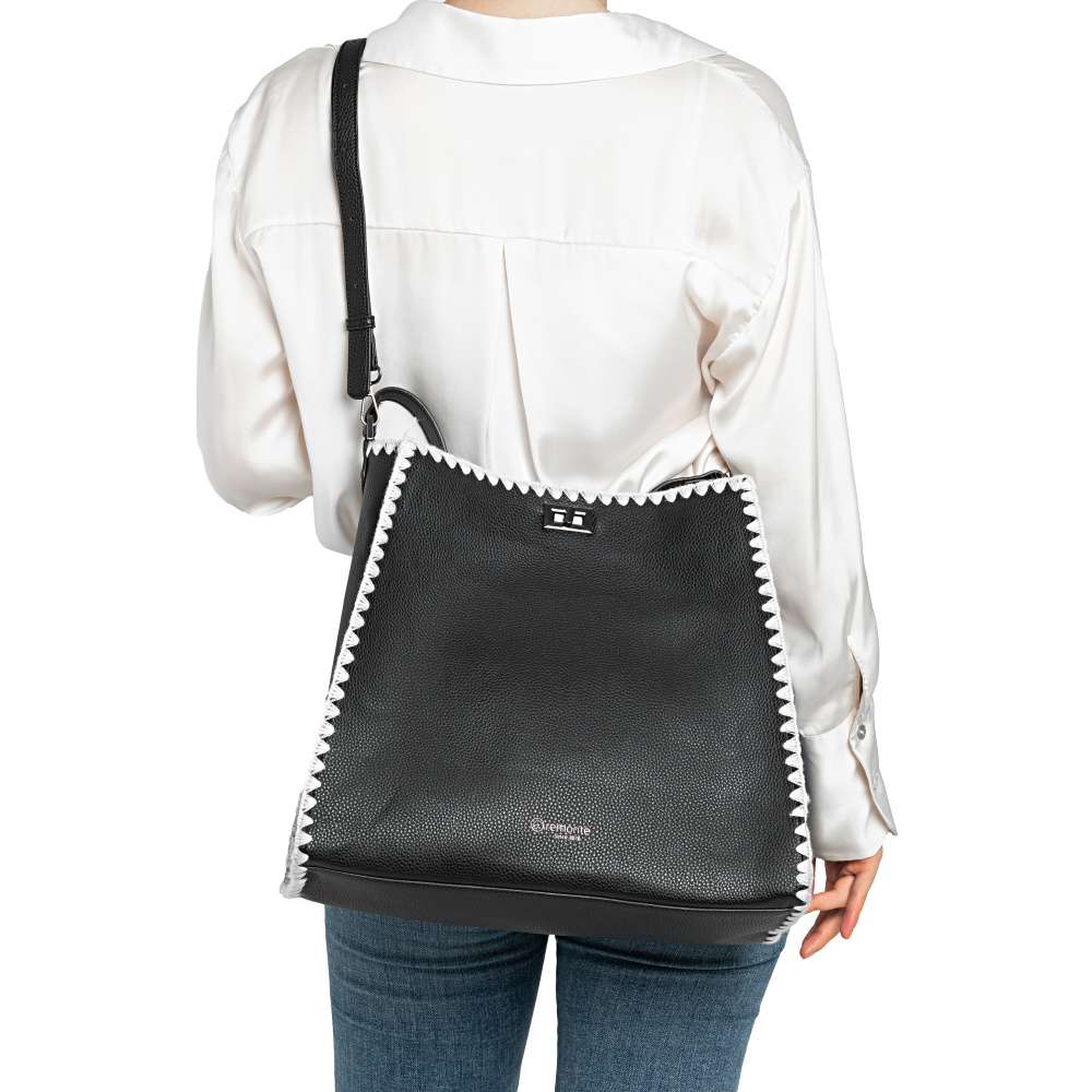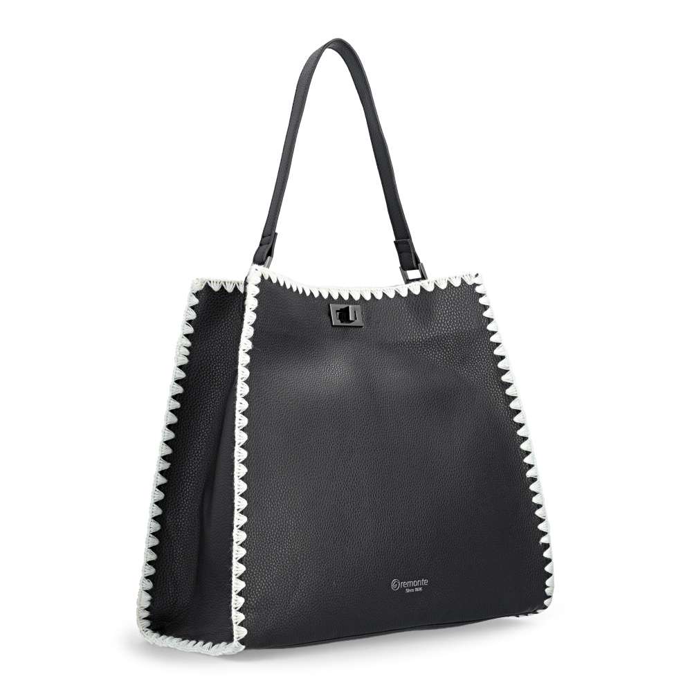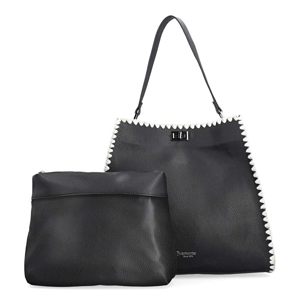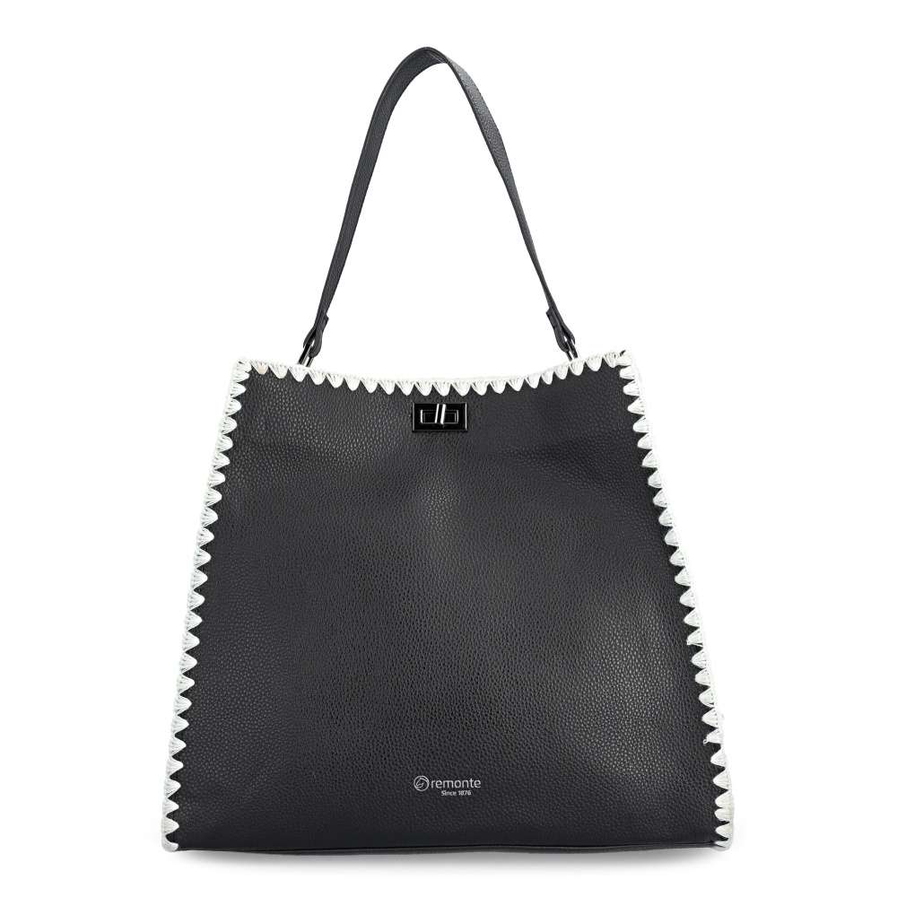 Značka REMONTE - jedná se o vyšší řadu Rieker, představuje kvalitu v moderním provedení doplňků pro Váš šatník. Černá kabelka zaujme kontrastním bílým lemováním po obvodu a elegantním logem značky na přední části, které jí dodává punc originality. O bezpečné a stylové uzavření se stará otočná spona – praktický detail s designovým efektem. Vnitřní samostatná kabelka se zipem vytváří po vložení přehledně dělený prostor, který umožňuje uspořádat všechny drobnosti a nezbytnosti. Variabilní nošení zajišťuje krátký pevný popruh pro elegantnější vzhled nebo délkově nastavitelný popruh, který lze připnout a vytvořit ležérnější vzhled. Kabelka je stylovým spojením praktičnosti a módního šarmu - ideální doplněk, který okamžitě zvýrazní každý outfit.