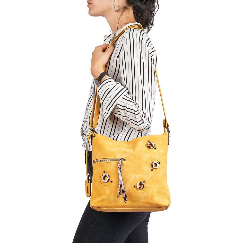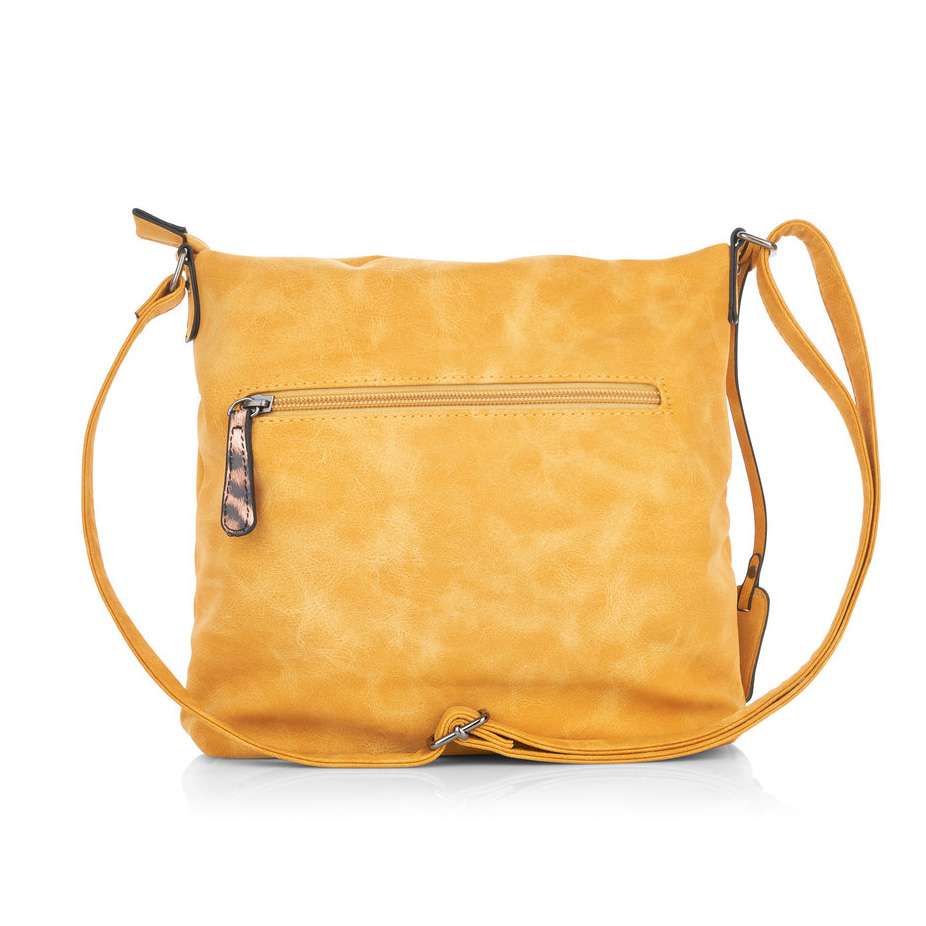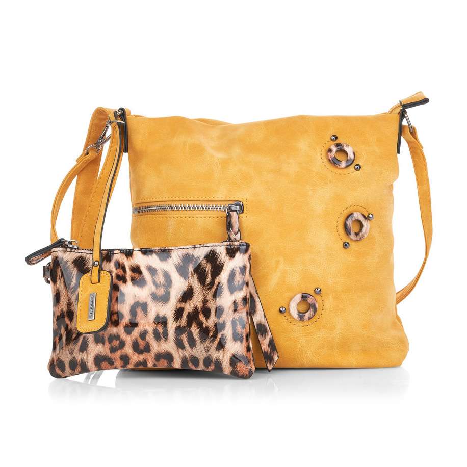 Dámská crossbody kabelka v unikátní žluté barvě je na svršku zdobena designovými prvky. Ve stejném designu je kabelka doplněna o malou peněženku, kterou můžete využít na cokoliv potřebujete. Tento originální kousek Vás upoutá svou nápaditostí.