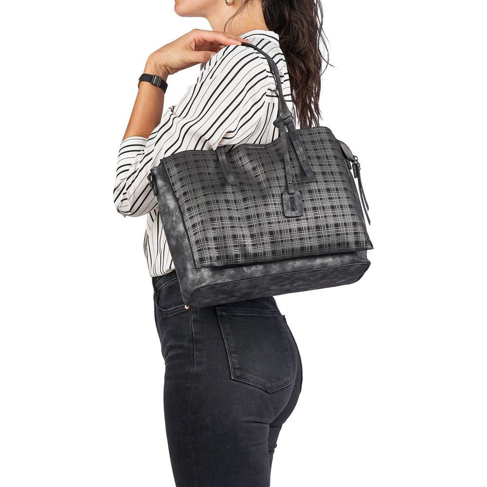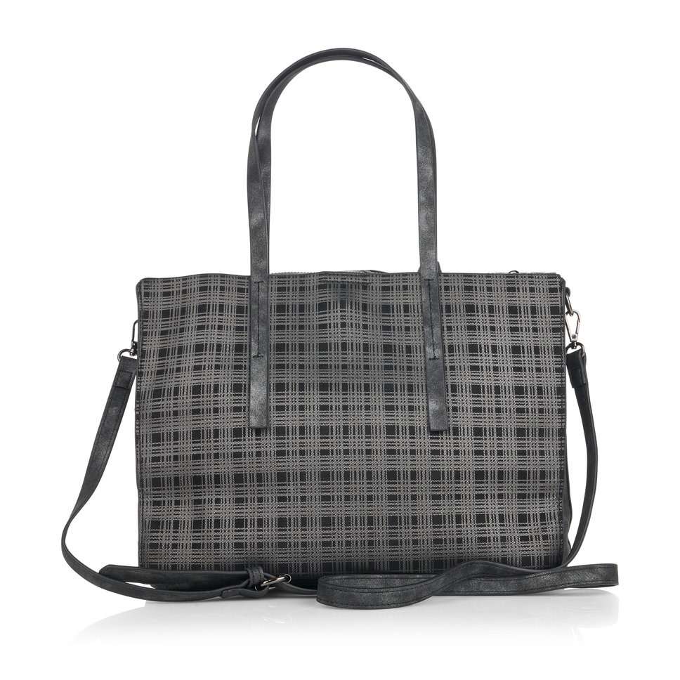 Elegantní dámská kabelka v metalické barvě má přední a zadní stranu v károvém vzoru a je zdobena přívěškem s logem značky. Jednoduše elegantní kabelku využijete do práce nebo třeba na nákupy do města.