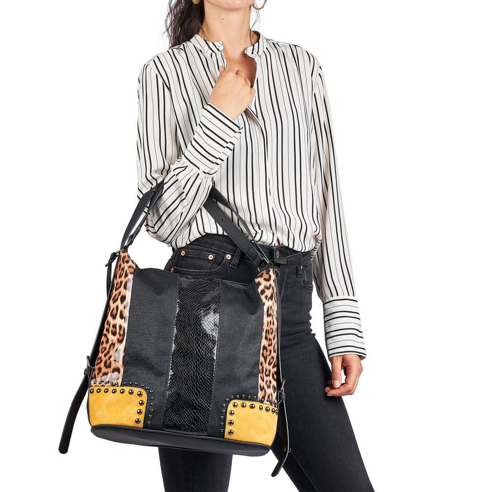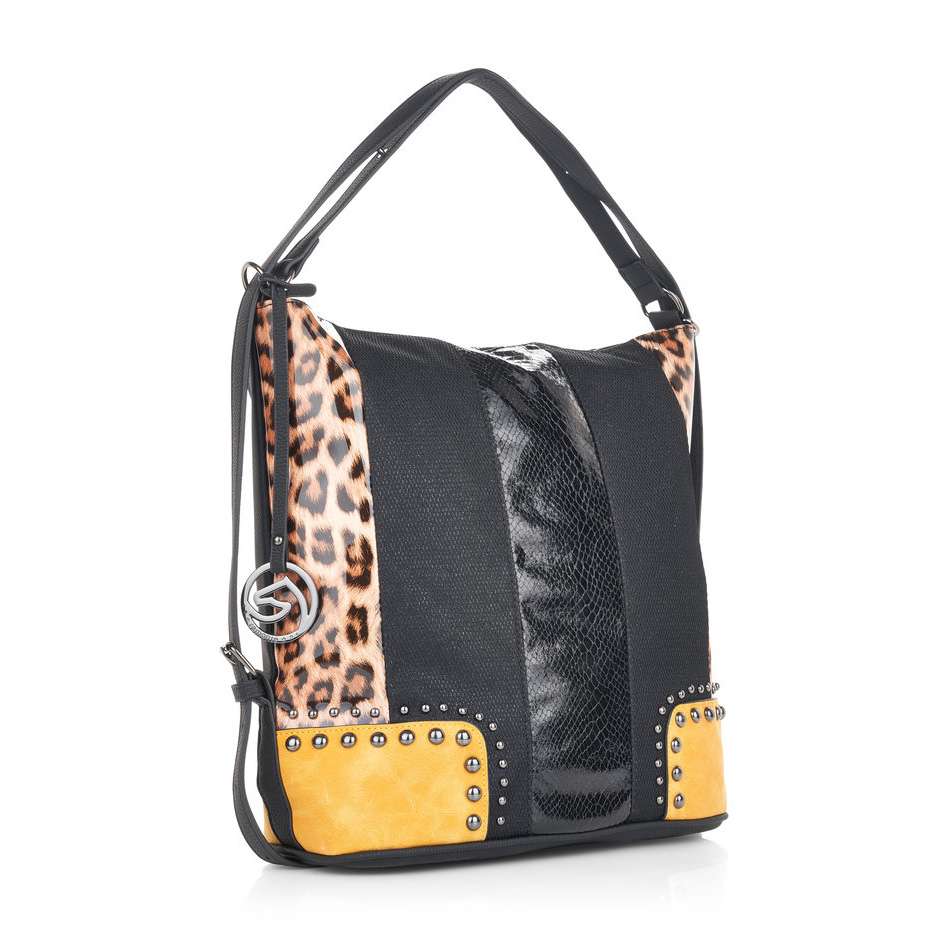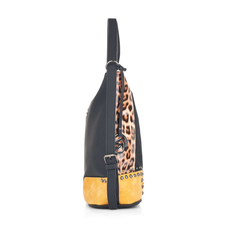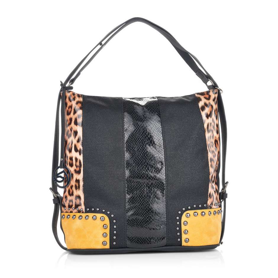 Dámská kabelka v unikátní barevné kombinaci je zdobena na přední a zadní straně designovým zvířecím vzorem, kovovými cvočky a přívěškem s logem značky. Tato krásná kabelka skvěle doplní Vaše outfity ať už do práce, či jen na procházku městem.