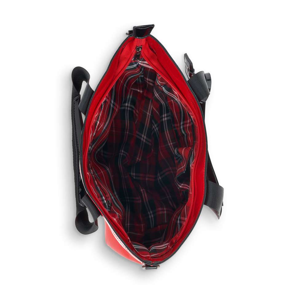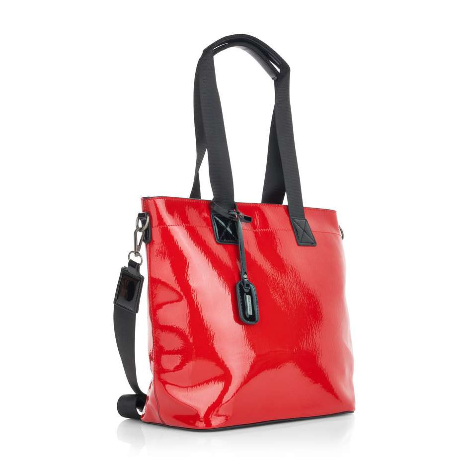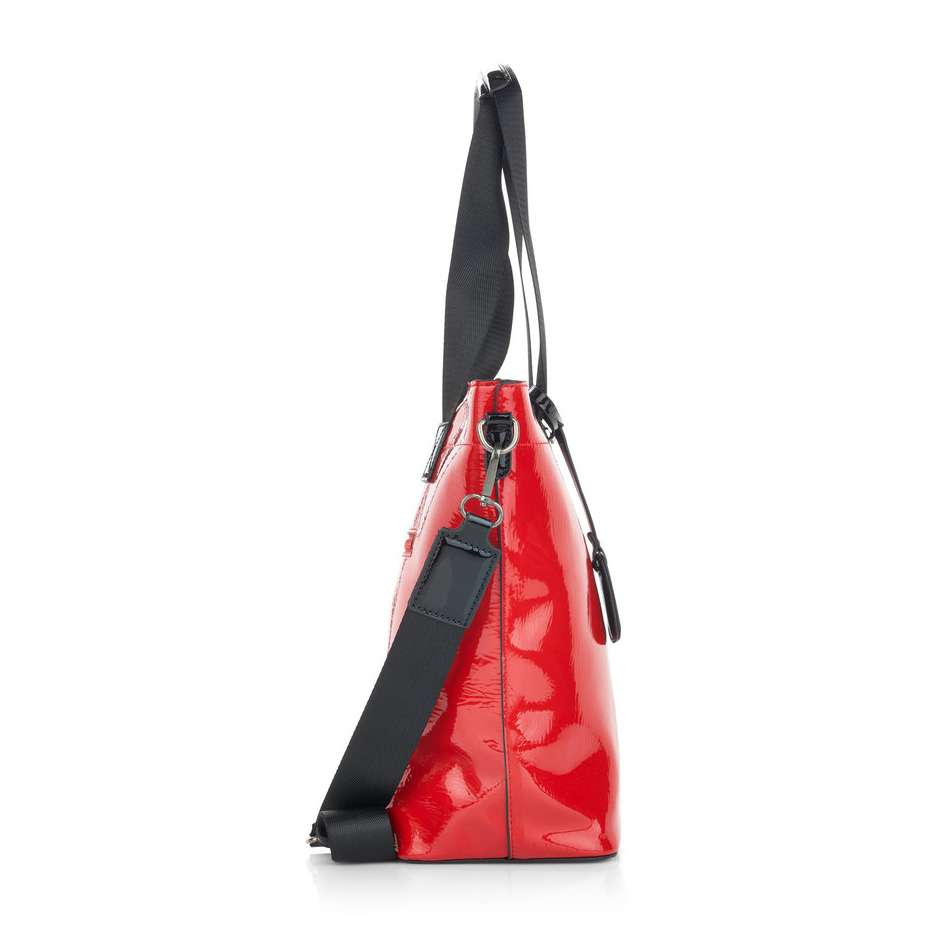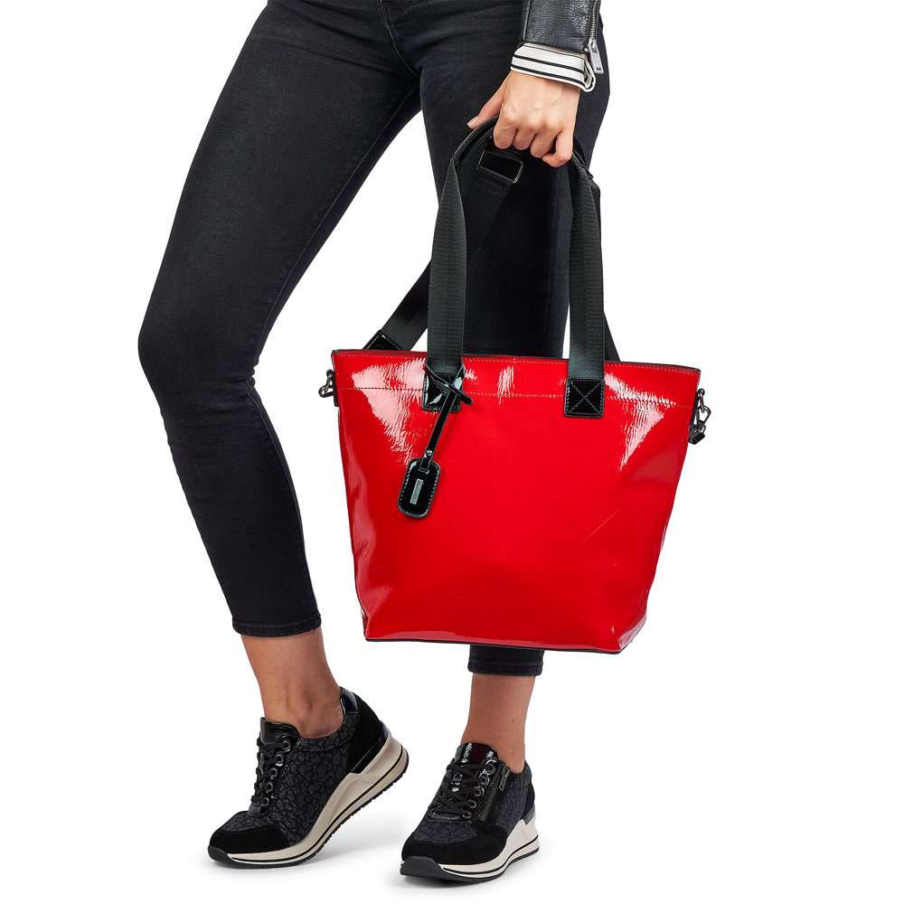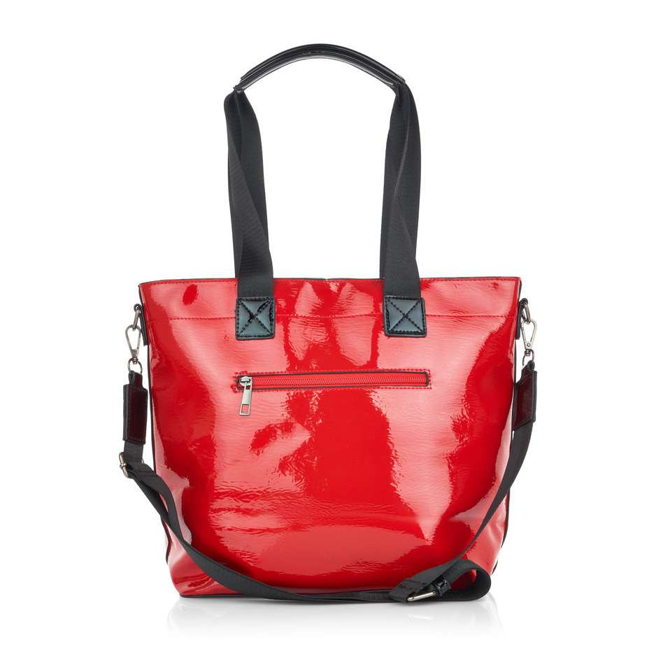Tato dámská kabelka v unikátní červené barvě má lesklý svršek, který je ozdoben černými prvky a přívěškem s logem značky. Tento originální kousek Vás upoutá svou nápaditostí a tím skvěle doplní Vaše outfity.