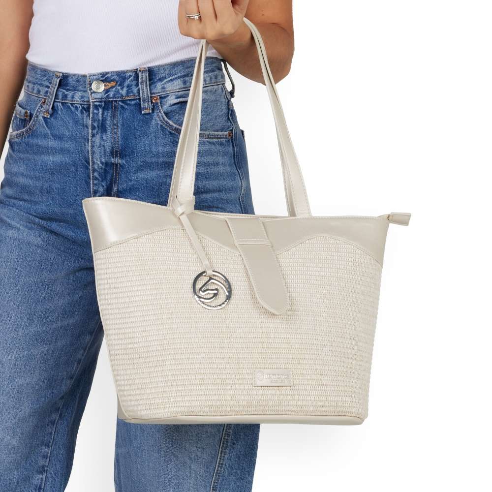 Pro dokonalé spojení elegance a praktičnosti vyberte kabelku RIEKER béžové barvy s jemnými odlesky a decentním vzorem. Kabelka je zdobená logem značky, které je umístěno i na visací aplikaci umístěné na úchytu, čímž získává moderní vzhled. Zadní malá kapsa poskytuje úložný prostor na drobnosti. Vrchní zip uzavírá prostorný interiér s menšími kapsami, což usnadňuje organizaci vašich věcí. Kabelka je vybavena dvěma popruhy pro nošení přes rameno, které přidávají na pohodlí. Tato kabelka je ideální volbou pro každodenní nošení a doplní váš outfit do práce i do města. Rozměry: cca V 27,5 cm x Š 42,5 cm Vnitřní uspořádání: kabelka není dělená