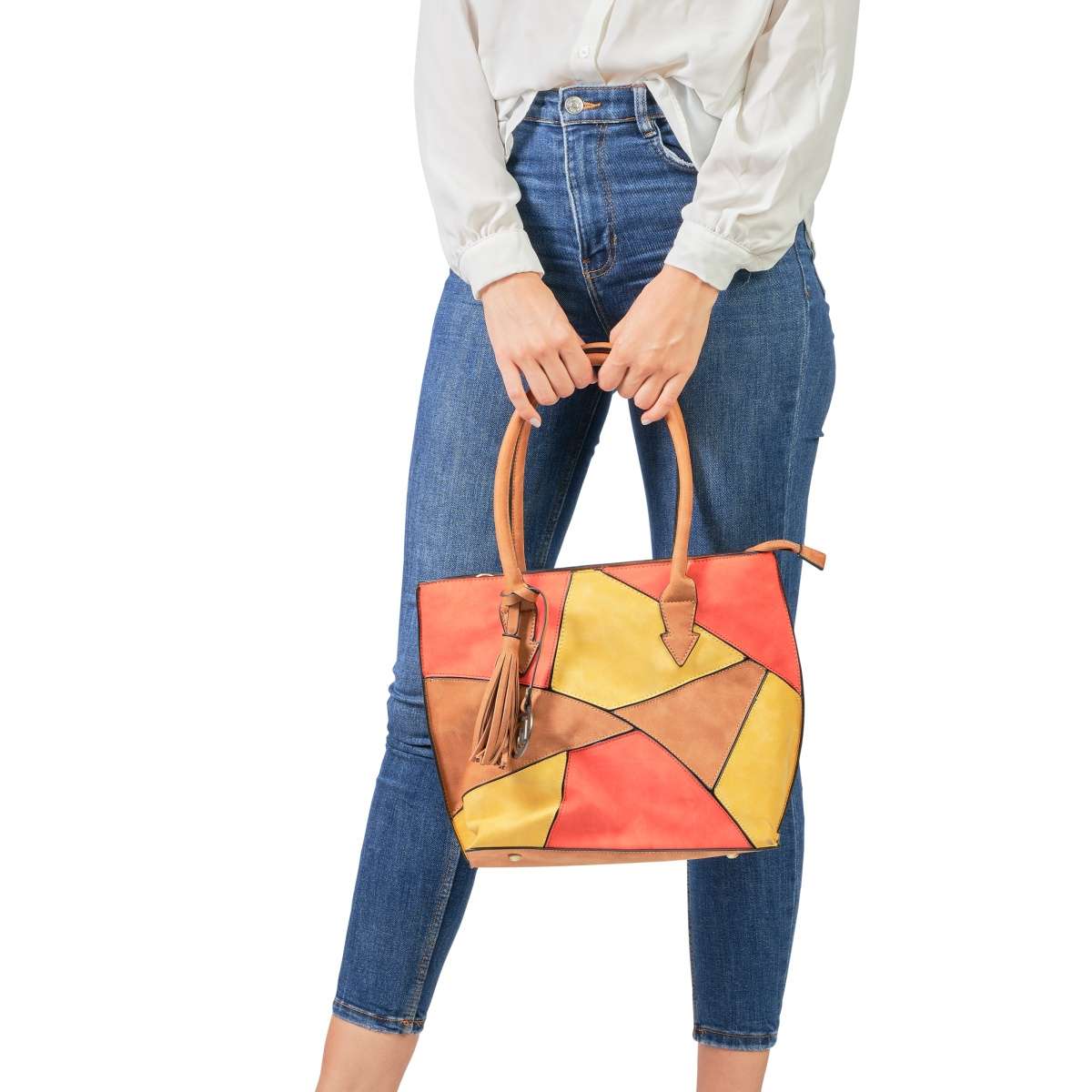 Originální dámská kabelka s třásňovým přívěskem, značky REMONTE (jedná se o vyšší řadu značky RIEKER). Tato dámská kabelka od značky REMONTE má nádherný svršek seskládaný z různých části, vzorů a kombinaci barev. Dalším ozdobným prvkem je třásňový přívěsek a kovové logo. Taška se uzavírá praktickým zipem, po jehož rozepnutí Vás mile překvapí krásná podšívka a několik kapes sloužící k uložení drobností. Má dvě ucha, díky kterým ji můžete nosit jak v ruce, tak i přes rameno. Tento model se určitě stane Vašim ideálním společníkem po celý den. Vlastnosti kabelky Materiál svršku: Syntetický materiál Vnitřní kapsy: ANO Ucha: ANO
