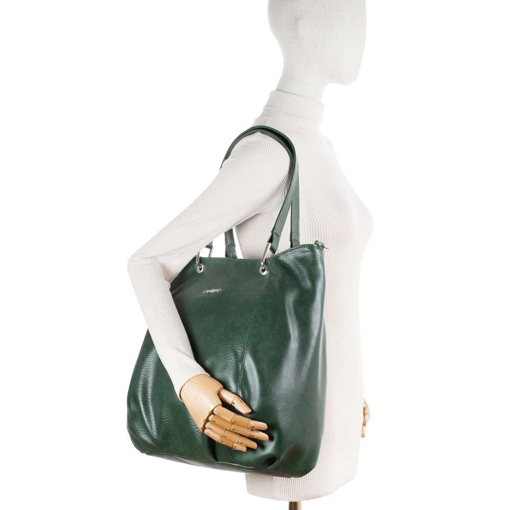 Atraktivní zelená barva kabelky RIEKER s efektními tmavšími liniemi okamžitě přitáhne pozornost a dodá vašemu outfitu sebevědomý nádech. Logo značky RIEKER ve stříbrné barvě decentně doplňuje celkový design a podtrhuje styl této značky. Její univerzálnost umožňuje snadné kombinování s různými outfity, ať už preferujete elegantní, ležérní nebo městský vzhled. Hlavní prostor uzavíraný zipem je dostatečně velký pro uložení všech nezbytností a díky dvěma postranním kapsám umožňuje jednoduchou organizaci drobných předmětů. Zadní část kabelky je vybavena menší kapsičkou pro uložení drobností, které budou snadno přístupné. Kabelka RIEKER nabízí flexibilitu nošení – můžete ji nosit za kratší úchyty nebo pohodlně nosit přes rameno i pomocí délkově nastavitelného a odepínatelného popruhu. Nadčasový design této kabelky vytváří všestranný doplněk, který doplní každý outfit. Je ideální pro ženy, které hledají praktickou, stylovou a univerzální kabelku vhodnou pro každodenní použití. Rozměry: cca V 39 cm x Š 35 cm x H 13 cm Vnitřní uspořádání: kabelka není dělená Kabelka má délkově nastavitelný popruh, který lze odepnout. Maximální délka nastavitelného popruhu je cca 125 cm.