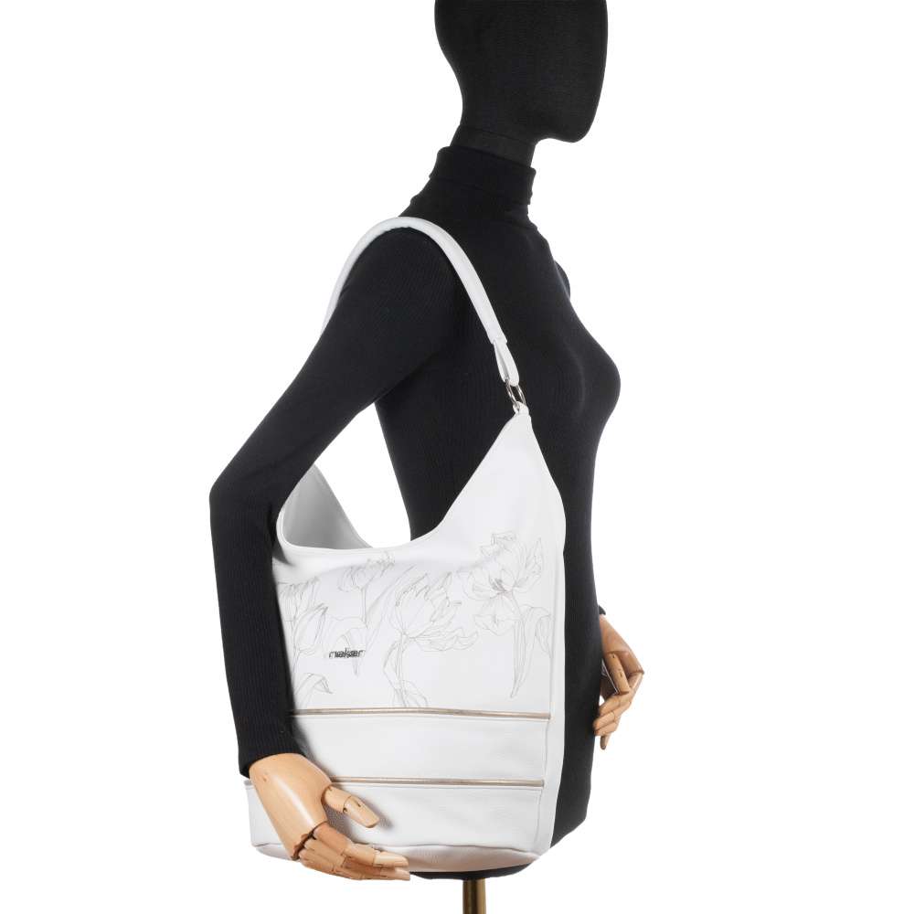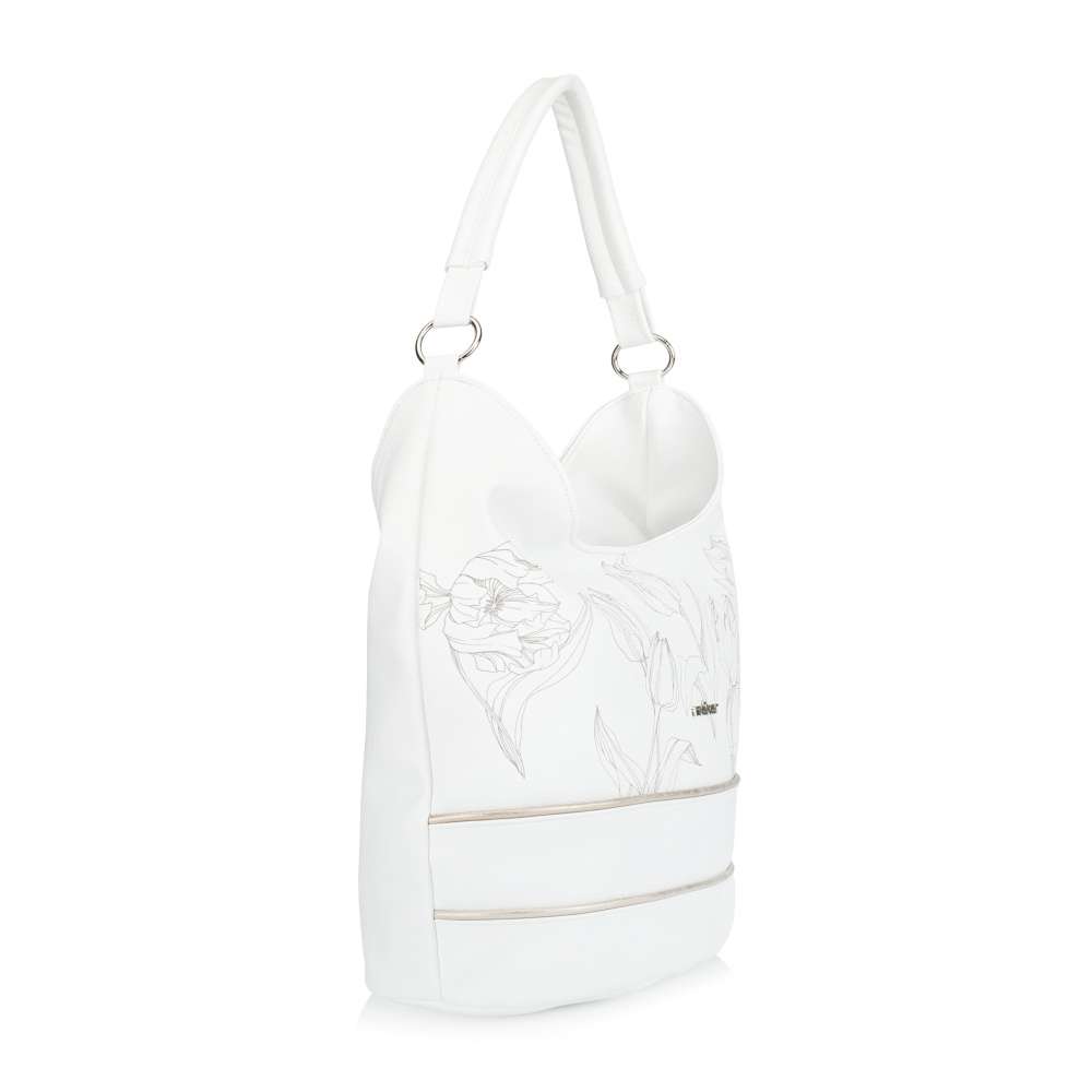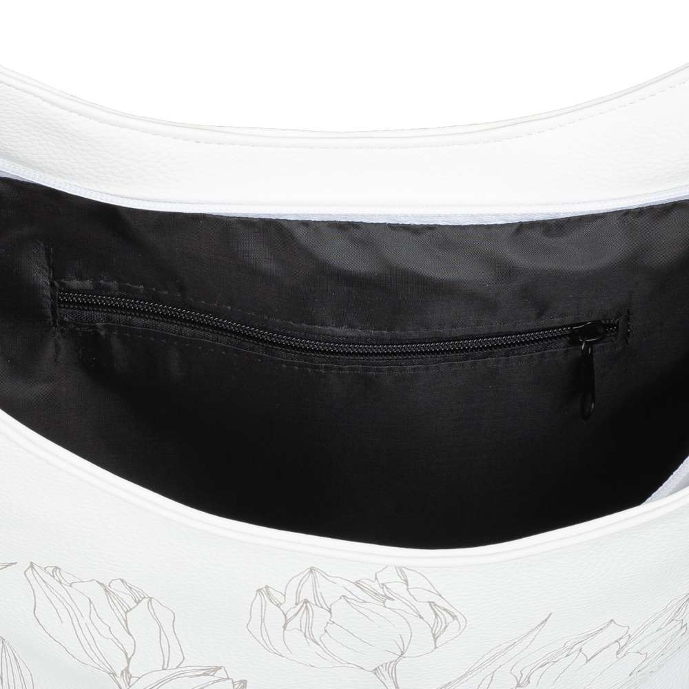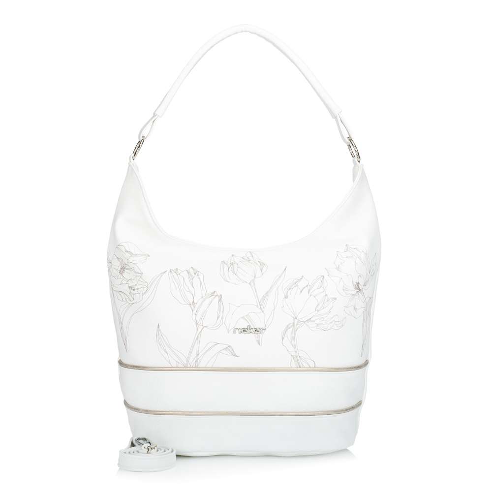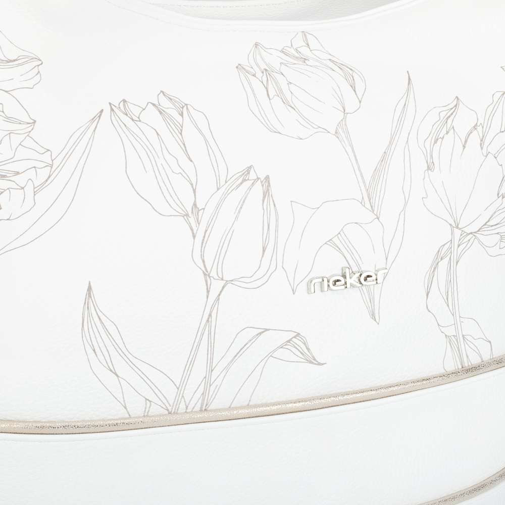 Vystupte z davu s okouzlující kabelkou od značky RIEKER, která dokonale spojuje jemnou eleganci s moderním šarmem. Bílý svršek zdobený něžným motivem tulipánů působí svěže, zatímco decentní stříbrné logo podtrhuje její jedinečný charakter a svěží linie přední části doplněné jemnými metalickými odlesky vytváří působivý módní kontrast. Tato kabelka však není jen krásným módním doplňkem – je také promyšleně navrženým každodenním společníkem. Praktické členění zahrnuje zadní kapsičku se zipem a hlavní prostor uzavřený zipem, ve kterém naleznete dvě menší přihrádky – jednu na zip a druhou otevřenou. Taška má kratší úchyt, ale také délkově nastavitelný popruh, který lze připnout a nastavit si jej k dokonalému pohodlí při nošení. Kabelka se díky svému designu hodí k ležérním outfitům do města, pracovním kombinacím ik elegantnějším příležitostem.