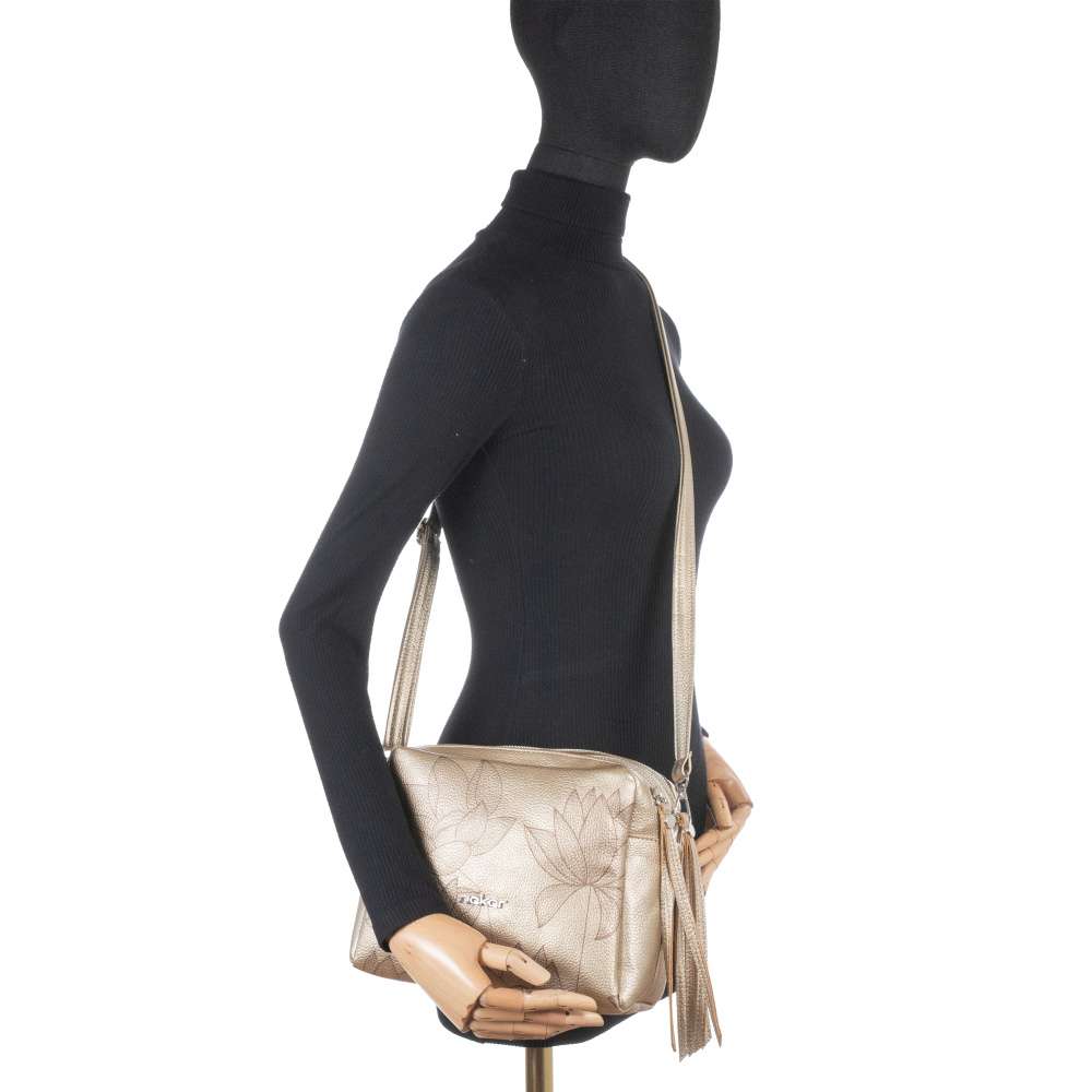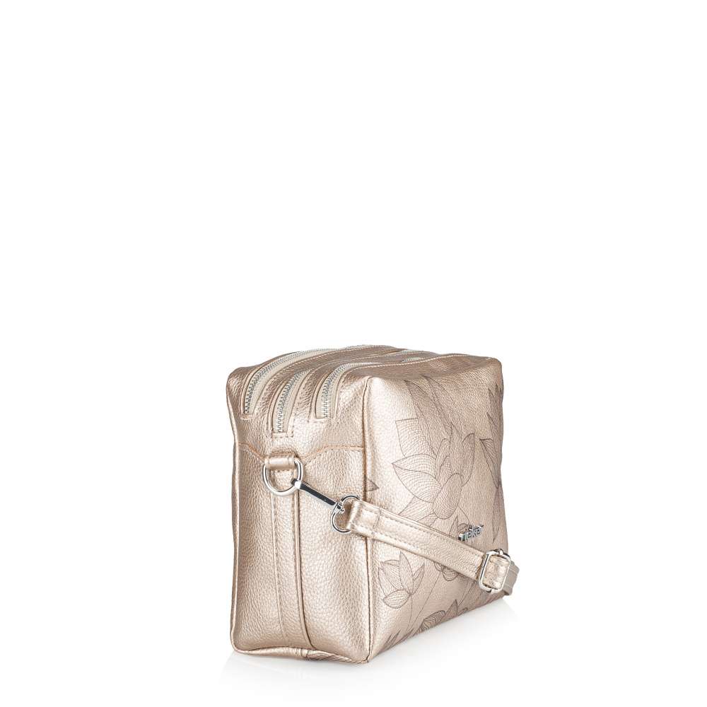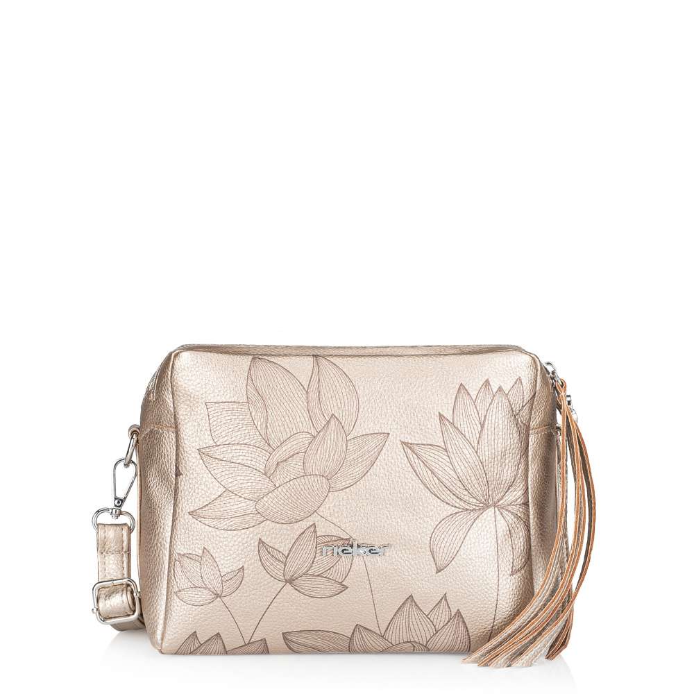 Tato kabelka RIEKER ve zlatém odstínu je doslova zářivým šperkem mezi doplňky, který rozzáří každý váš den i outfit. Efektní materiál s jemným květinovým potiskem působí něžně a romanticky, zatímco stříbrné logo značky dodává kabelce nádech originality. Promyšlené vnitřní uspořádání nabízí tři samostatné prostory na zip s výraznou visačkou, díky kterým budete mít vše přehledně uloženo. Středový oddíl ukrývá dvě kapsičky - jednu na zip pro vaše cennosti a druhou otevřenou, abyste měli drobnosti vždy po ruce. Odepínatelný a nastavitelný popruh vám umožní nosit kabelku přesně tak, jak se cítíte. Tato kabelka není jen praktickým doplňkem, ale také výrazem vaší osobnosti a ženského půvabu, který z vás udělá nepřehlédnutelnou hvězdu každého dne. Rozměry: cca V 17 cm x Š 24 cm x H 10 cm Vnitřní uspořádání: kabelka je dělená. Kabelka má délkově nastavitelný popruh, který lze odepnout. Maximální délka nastavitelného popruhu je cca 125 cm.
