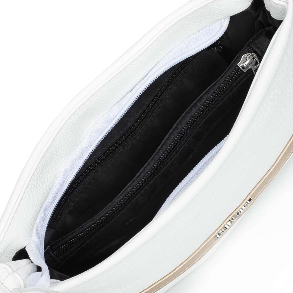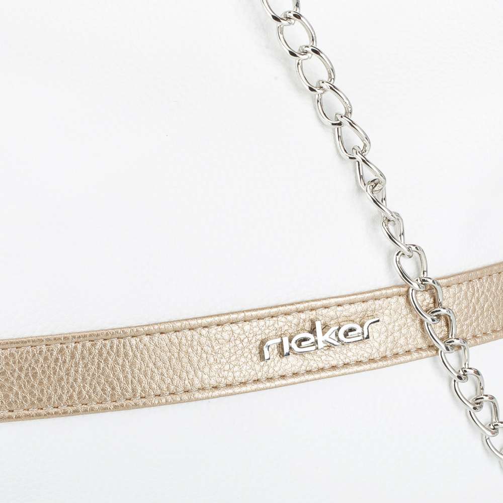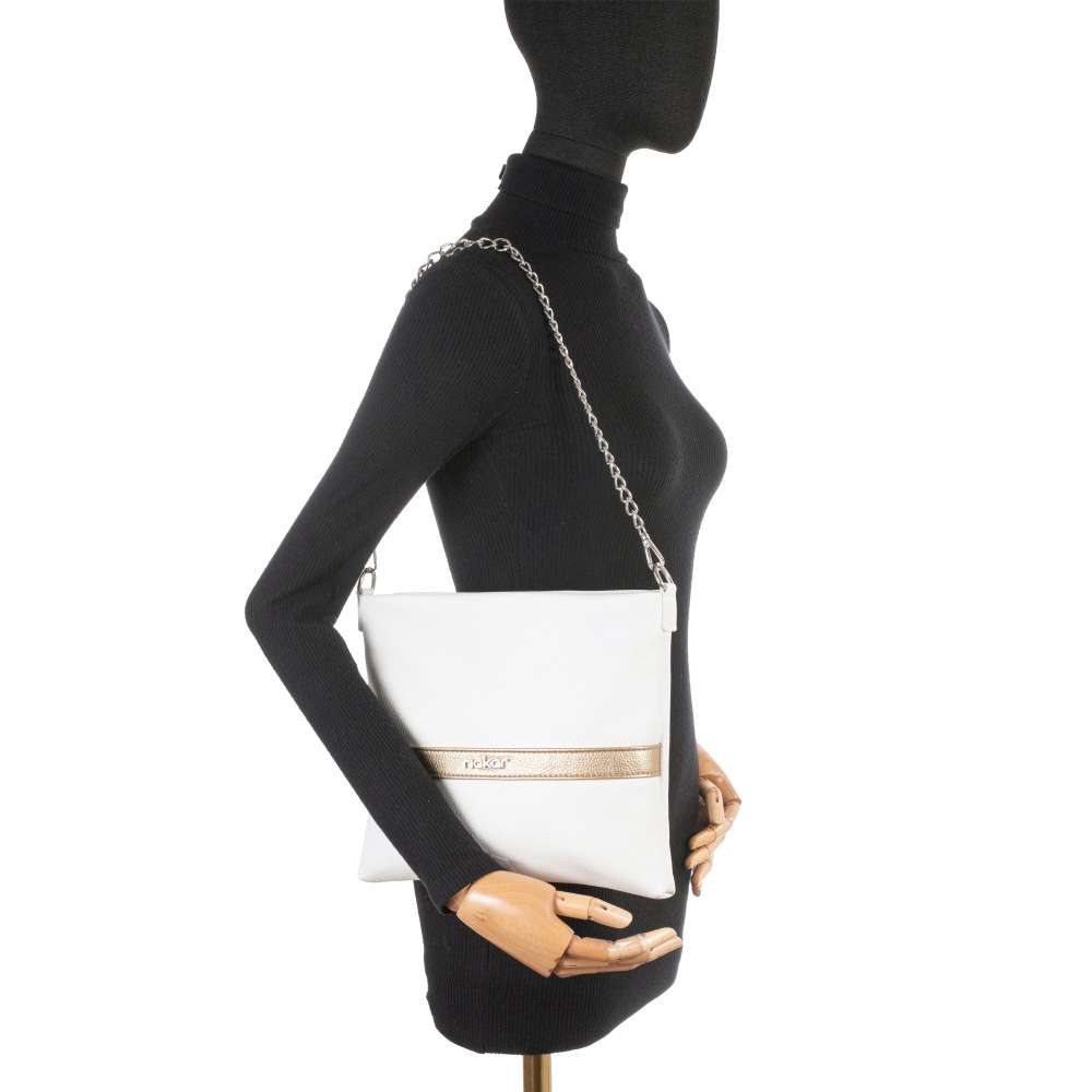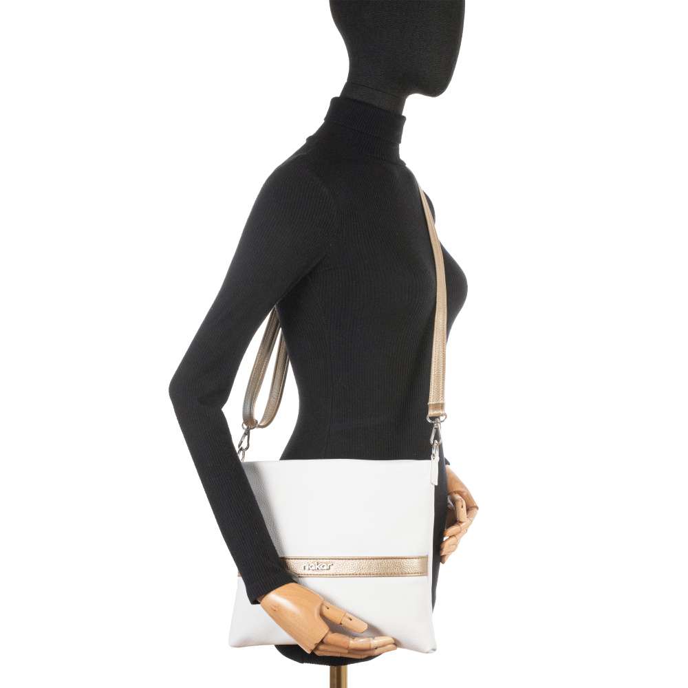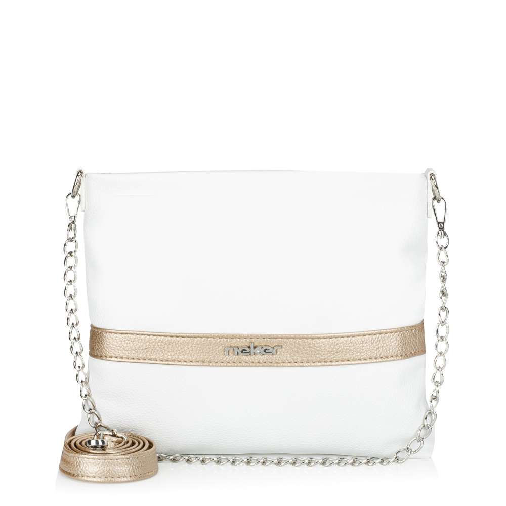 Nechte se okouzlit kabelkou RIEKER, která kombinuje jedinečný styl a praktičnost. Bílý svršek je zdoben páskem se zlatými odlesky a stříbrným logem značky, které dodává kabelce nádech luxusu a elegance. Dvě možnosti nošení vám umožní kabelku přizpůsobit vašemu outfitu i náladě – elegantně přes rameno nebo trendy křížem přes tělo. Řetízek přidává zářivý detail, zatímco nastavitelný popruh zajišťuje maximální pohodlí při každodenním nošení. Stačí si vybrat, který způsob vám v daný moment vyhovuje víc. Vnitřek kabelky je navržen tak, aby vám nabídlo přehled o uložených věcech. Hlavní prostor je rozdělen středovou kapsou uzavřenou zipem a doplněn o menší kapsy, díky kterým si můžete jednoduše uspořádat všechny potřebné věci. Ať se chystáte do města, do práce, na nákupy nebo na setkání s přáteli, tato kabelka Vás bude provázet šarmem a praktickým využitím.