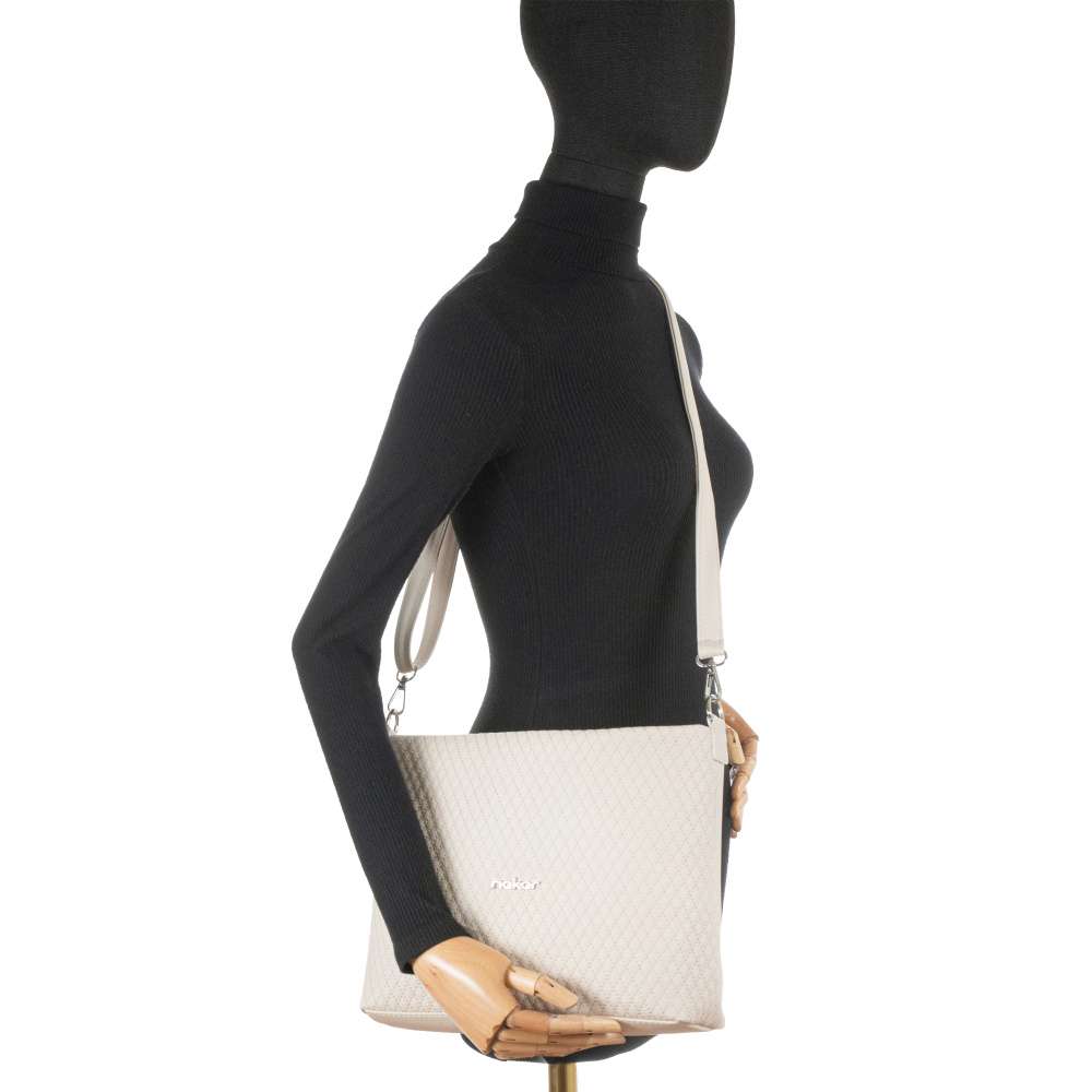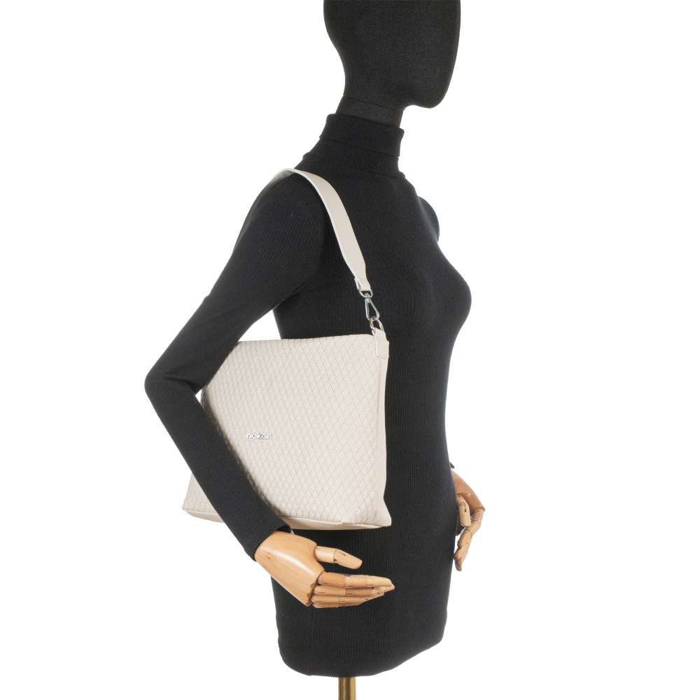 Kabelka značky RIEKER v jemném béžovém provedení zaujme propracovaným vzorem prošití, který dodává povrchu texturu a sofistikovaný nádech. Stříbrné logo značky přidává kabelce nenápadný podpis originality. Praktičnost je zde promyšleně spojena s estetikou, zadní kapsa na zip poskytuje rychlý přístup k drobnostem, které chcete mít vždy po ruce. Hlavní prostor uzavíraný zipem nabízí dostatek místa pro vše, co během dne potřebujete, a je prakticky členěný středovou přihrádkou, která udrží vaše věci v dokonalé organizaci. Menší vnitřní kapsy po stranách jsou ideální pro uložení telefonu, kosmetiky či drobností. Kabelka je vybavena dvěma odnímatelnými popruhy – kratším pevným a delším nastavitelným ramenním popruhem, který umožňuje nastavení pro maximální pohodlí během dne. Tento model je dokonalým spojením stylu, funkčnosti a komfortu – ideální volba pro každodenní nošení do práce, do města či pro setkání s přáteli.