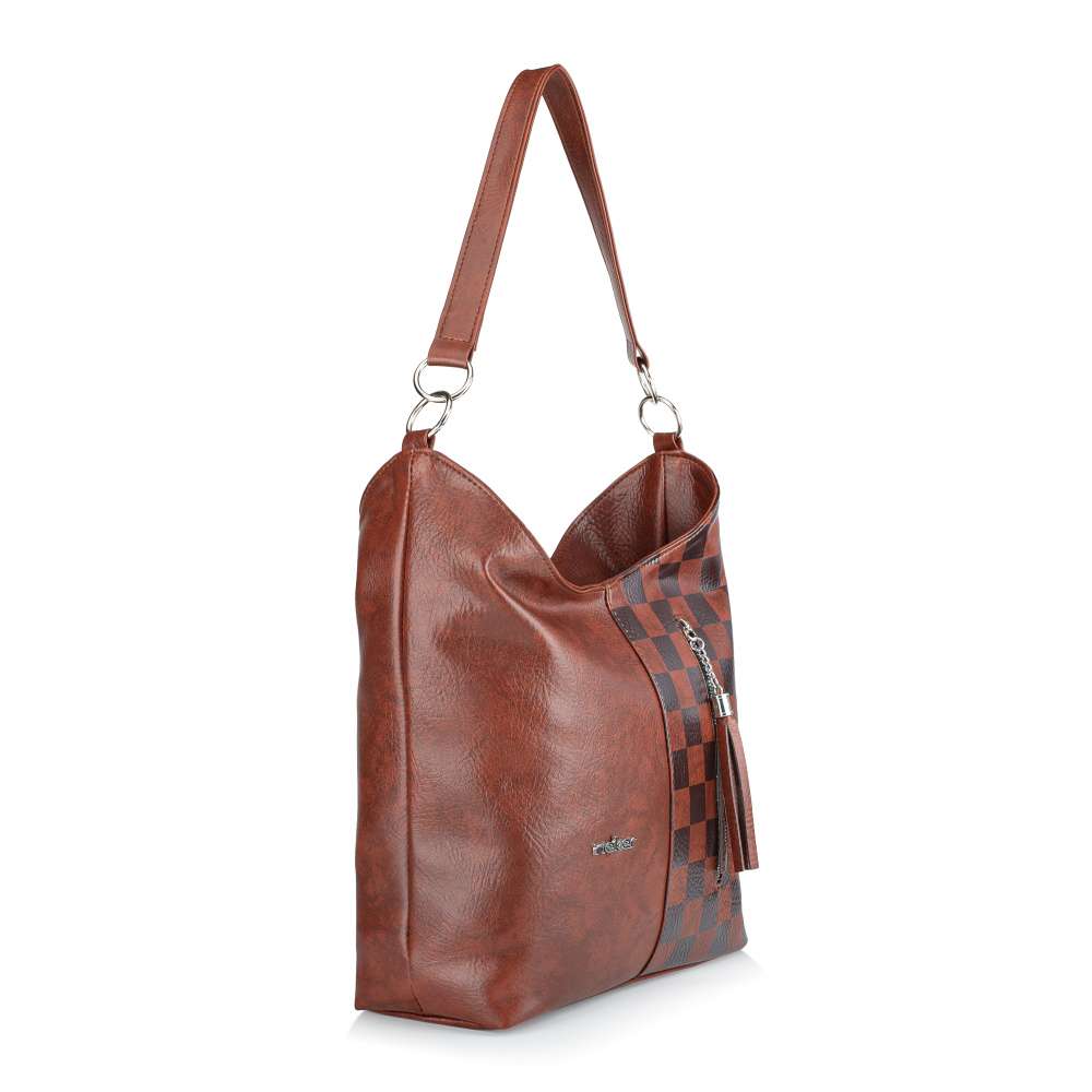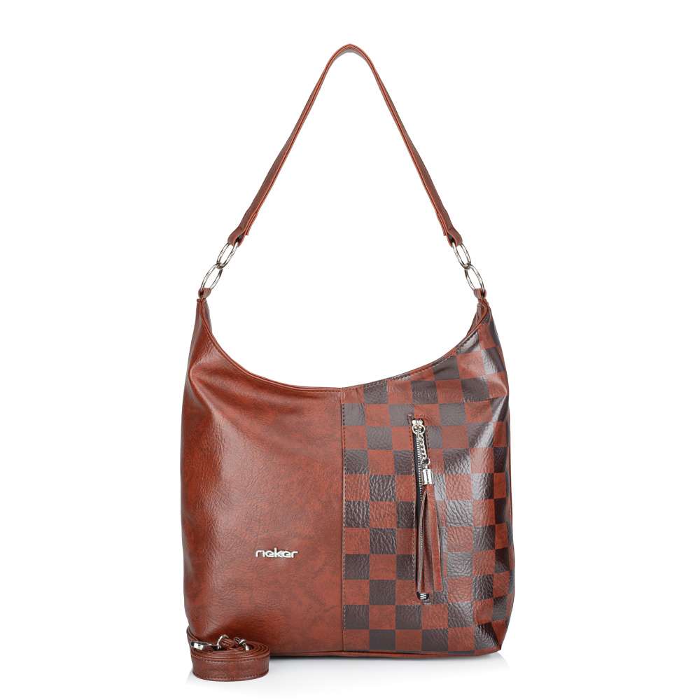 Tato hnědá kabelka značky RIEKER je ideálním doplňkem pro ženy, které hledají praktičnost zabalenou do moderního designu. Na první pohled zaujme kombinací kontrastních čtvercových vzorů, které vytváří atraktivní vizuální efekt a modelu dodává stylovou originalitu logo značky stříbrné barvy. Přední část ozvláštňuje také výrazná aplikace zipu na praktické kapsičce, která je nejen funkčním, ale také designovým prvkem. Zadní část kabelky nabízí další praktickou kapsu na zip, kterou oceníte pro uložení drobností, ke kterým potřebujete mít rychlý přístup. Hlavní prostor je bezpečně uzavřen zipem a uvnitř najdete dvě přihrádky – jednu otevřenou pro snadný přístup a druhou uzavíratelnou zipem, která poskytne spolehlivou ochranu vašim cennějším věcem. O pohodlné nošení se postarají dvě odepínatelné varianty - kratší pevný popruh a ramenní popruh s možností nastavení délky, který vám umožní kabelku přizpůsobit dle aktuální potřeby. Tato kabelka je dokonalou kombinací praktičnosti a stylu – spolehlivě vás doplní v každodenním městském životě a podtrhne váš osobitý vkus. Rozměry: cca V 28 cm x Š 36 cm x H 11 cm Vnitřní uspořádání: kabelka není dělená. Kabelka má délkově nastavitelný popruh, který lze odepnout. Maximální délka nastavitelného popruhu je cca 130 cm. Délka popruhu pro nošení přes rameno je cca 60 cm.