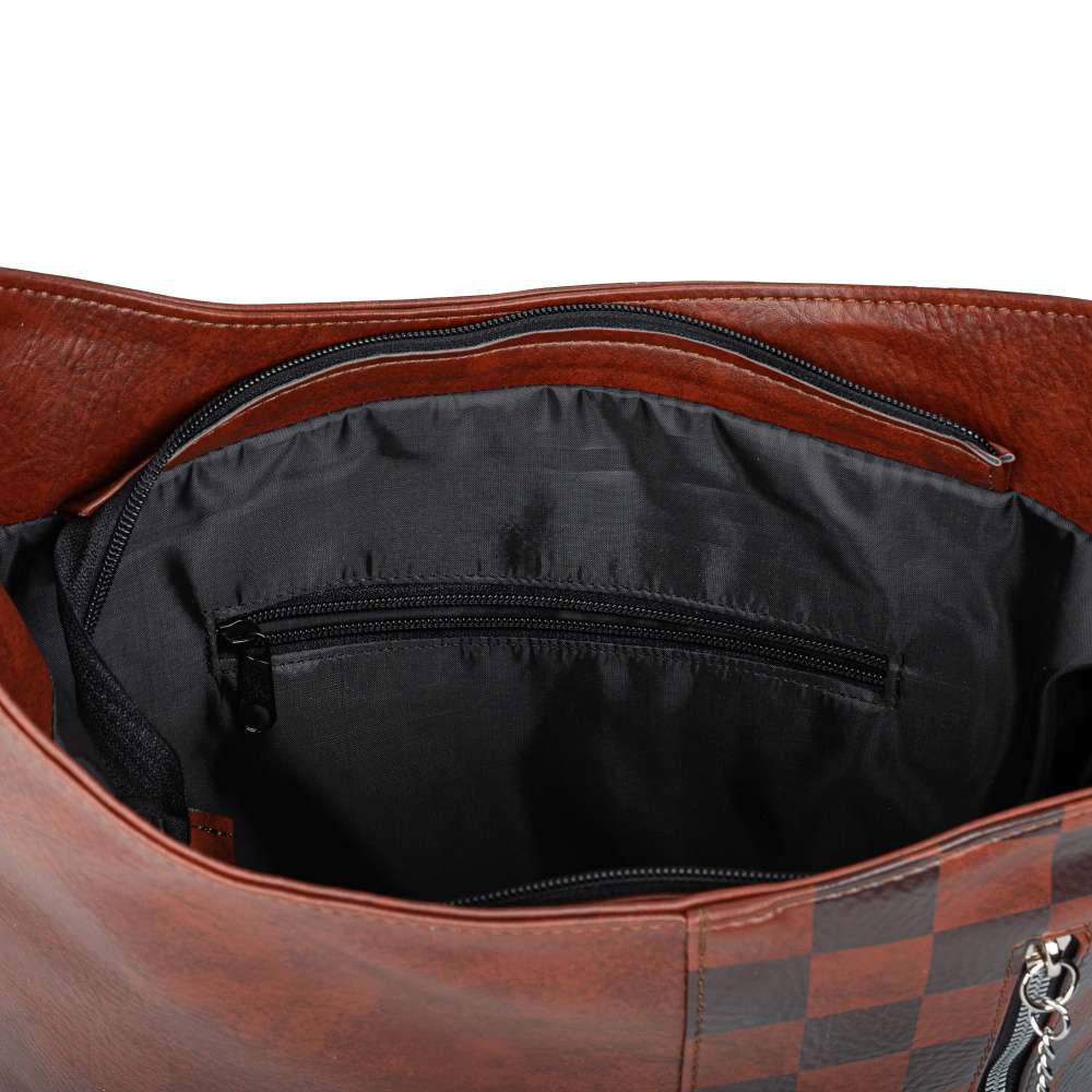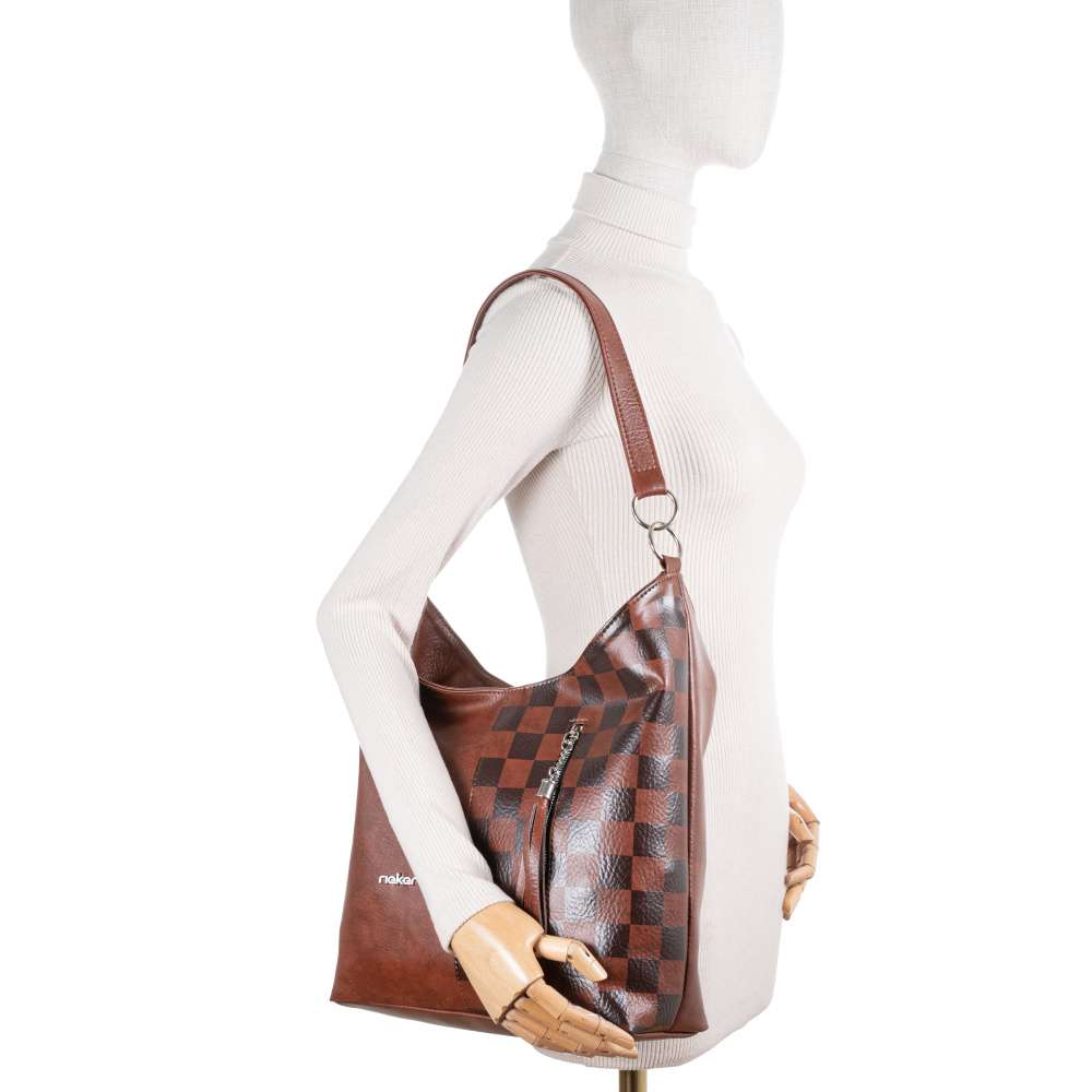Detailní informace Tato hnědá kabelka značky RIEKER je ideálním doplňkem pro ženy, které hledají praktičnost zabalenou do moderního designu. Na první pohled zaujme kombinací kontrastních čtvercových vzorů, které vytváří atraktivní vizuální efekt a modelu dodává stylovou originalitu logo značky stříbrné barvy. Přední část ozvláštňuje také výrazná aplikace zipu na praktické kapsičce, která je nejen funkčním, ale také designovým prvkem. Zadní část kabelky nabízí další praktickou kapsu na zip, kterou oceníte pro uložení drobností, ke kterým potřebujete mít rychlý přístup. Hlavní prostor je bezpečně uzavřen zipem a uvnitř najdete dvě přihrádky – jednu otevřenou pro snadný přístup a druhou uzavíratelnou zipem, která poskytne spolehlivou ochranu vašim cennějším věcem. O pohodlné nošení se postarají dvě odepínatelné varianty - kratší pevný popruh a ramenní popruh s možností nastavení délky, který vám umožní kabelku přizpůsobit dle aktuální potřeby. Tato kabelka je dokonalou kombinací praktičnosti a stylu – spolehlivě vás doplní v každodenním městském životě a podtrhne váš osobitý vkus.