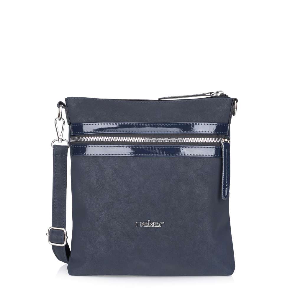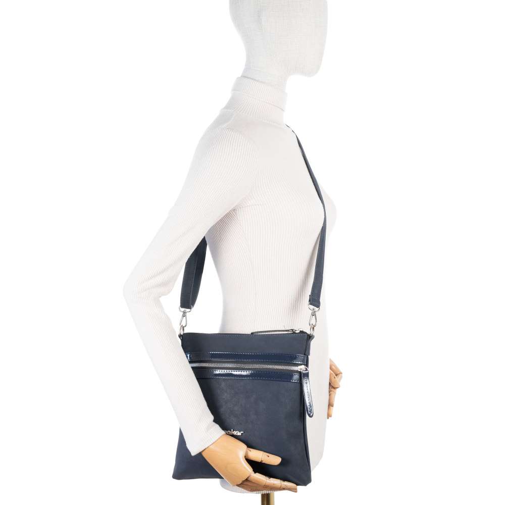 Tato kabelka RIEKER v tmavě modré barvě zaujme svým atraktivním materiálovým provedením, které dodává designu prémiový vzhled. Lesklé doplňky elegantně zvýrazňují ženský půvab, zatímco stříbrné logo značky na přední straně dodává kabelce punc originality a jedinečného stylu. Funkčnost je stejně přepracovaná jako design. Přední kapsička se zipem je navržena na drobnosti, které chcete mít rychle po ruce a zadní kapsička se zipem poskytuje dodatečný úložný prostor pro praktické uspořádání menších předmětů, které potřebujete mít bezpečně uložené. Hlavní prostor kabelky se uzavírá vrchním zipem a je vybaven dvěma menšími přihrádkami, z nichž jedna je otevřena pro rychlý přístup k věcem a druhá uzavírána zipem, ideální pro bezpečné uložení drobných věcí. O pohodlí při nošení se stará délkově nastavitelný popruh, který si můžete přizpůsobit podle svých potřeb - ať už preferujete nošení přes rameno nebo stylově křížem přes tělo. Díky tomu si každá můžete přizpůsobit nošení dle vlastních preferencí a situace. Rieker přináší doplněk, který vás nezklame – praktický, moderní a připravený držet krok s vaším tempem každý den. Objevte spojení funkčnosti a stylu, které budete milovat! Rozměry: cca V 25 cm x Š 22 cm x H 3 cm Vnitřní uspořádání: kabelka není dělená. Kabelka má délkově nastavitelný popruh, který lze odepnout. Maximální délka nastavitelného popruhu je cca 130 cm.