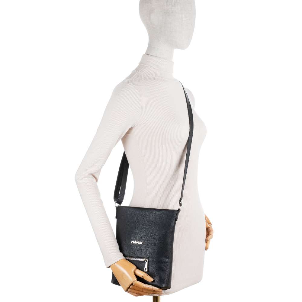 Tato menší kabelka značky RIEKER je skvělým společníkem pro ženy, které hledají univerzální doplněk v trendy stylu. Černý svršek působí nadčasově a snadno se kombinuje s různými outfity, ať už se jedná o běžné denní nošení nebo večerní program. Přední strana je ozdobena dekorativním logem značky ve stříbrné barvě a doplněna o výrazný zip přední kapsičky, který kabelce dodává moderní akcent. Vrchní zip odhaluje prakticky řešený interiér. Hlavní prostor je doplněn o dvě menší kapsičky – jedna je otevřená a ideální na drobnosti, které potřebujete mít rychle po ruce, zatímco druhá je uzavíratelná zipem, díky čemuž bezpečně uschováte cennější předměty. Celkové uspořádání interiéru tak poskytuje dostatek místa pro vaše každodenní nezbytnosti. Kabelka je vybavena délkově nastavitelným ramenním popruhem, který přináší nejen maximální pohodlí při nošení, ale také flexibilitu – kabelku můžete nosit přes rameno nebo stylově křížem přes tělo. Kompaktní velikost, nadčasová barva a praktické detaily dělají z této kabelky ideálního společníka pro každý den, který vás nikdy nezklame. Rozměry: cca V 23 cm x Š 18 cm x H 5 cm Vnitřní uspořádání: kabelka není dělená. Kabelka má délkově nastavitelný popruh, který nelze odepnout. Maximální délka nastavitelného popruhu je cca 130 cm.