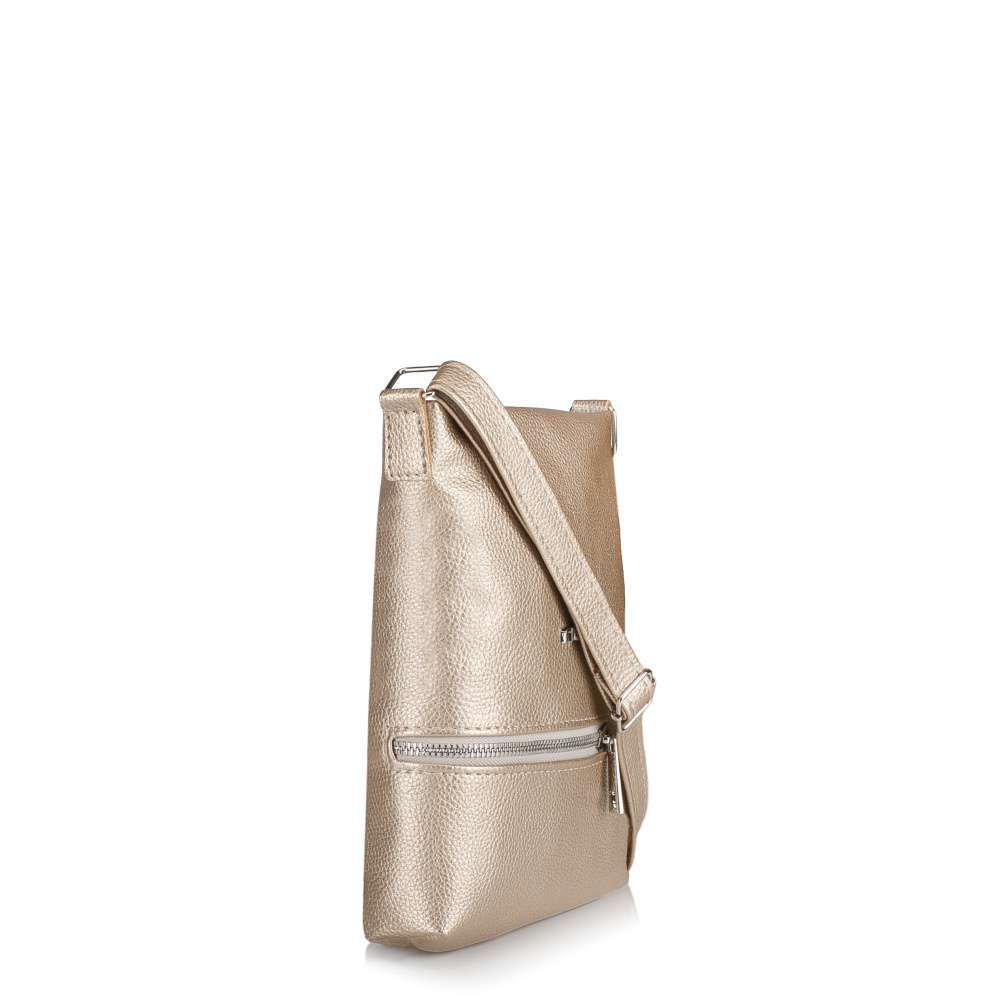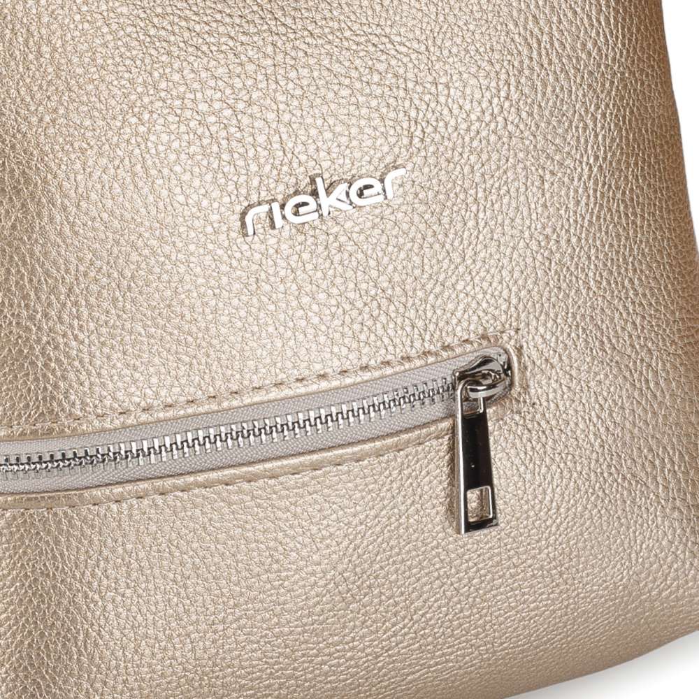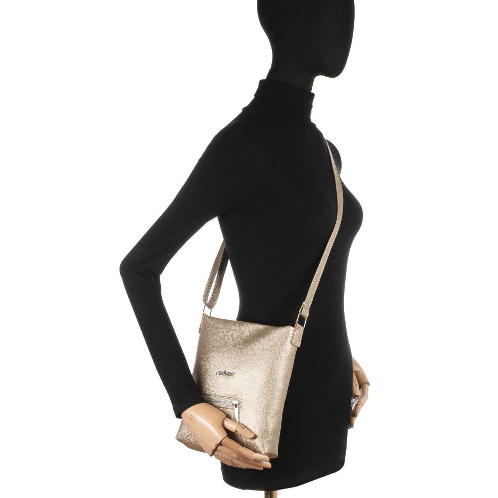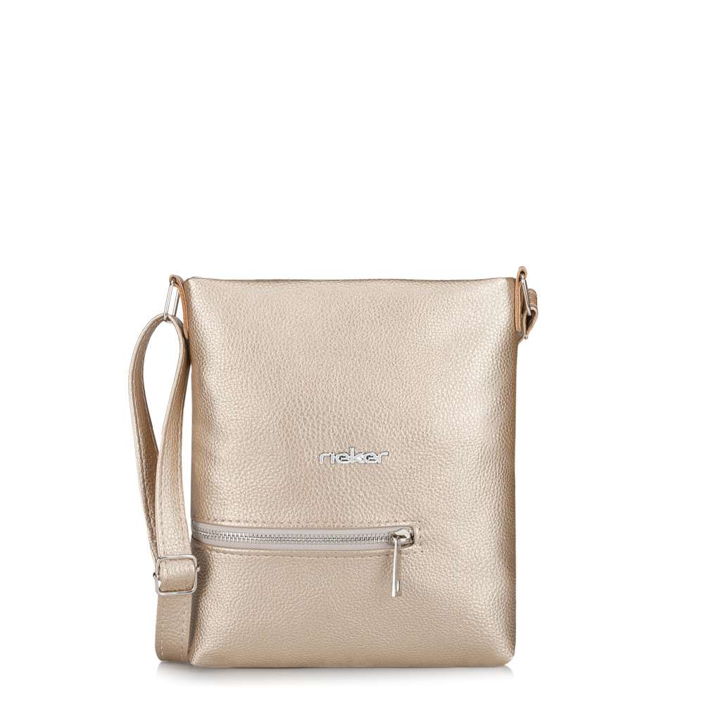 Zlaté odlesky kabelky RIEKER rozzáří každý váš outfit a dodají okouzlující výraz každé z vás. Logo značky stříbrné barvy přidává kabelce nenápadný, ale prestižní podpis originality. Po otevření vrchního zipu vás přivítá promyšleně uspořádaný interiér, který spojuje styl s praktičností. Dvě menší kapsičky se postarají o dokonalý přehled – otevřena na drobnosti, které chcete mít vždy po ruce, a uzavíratelná na zip, aby vaše cennosti zůstaly v bezpečí. Určitě oceníte také menší přední kapsičku, ideální k uložení snadno dostupných věcí. Nastavitelný popruh vám umožní nosit kabelku přesně tak, jak to vyhovuje vašemu dni i náladě – ležérně přes rameno nebo stylově křížem přes tělo. Je kompaktní, ale výrazná. Jemná, ale nepřehlédnutelná. Tato kabelka není jen doplněk – je to detail, který podtrhne vaši osobnost a bude vás spolehlivě doprovázet každým dnem.