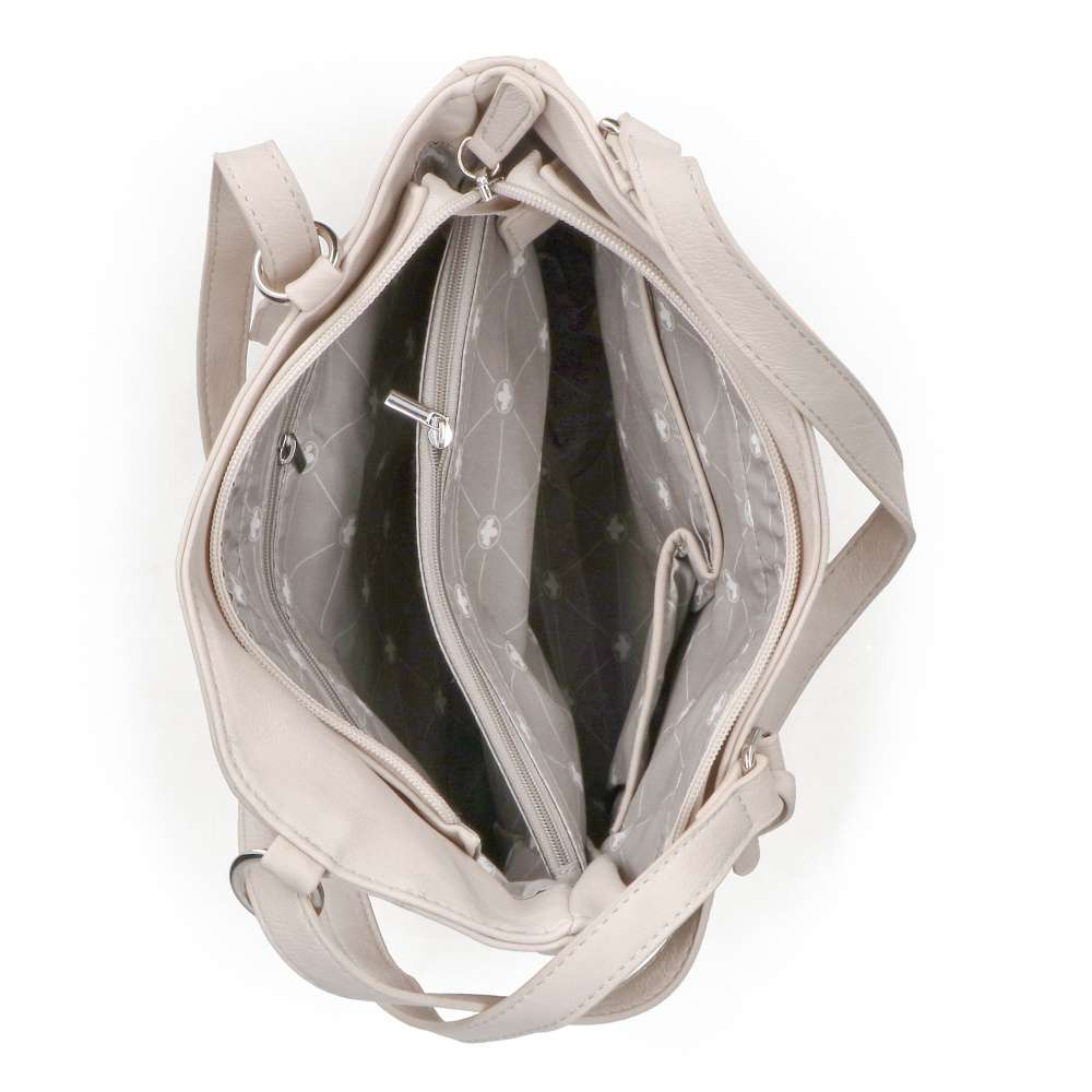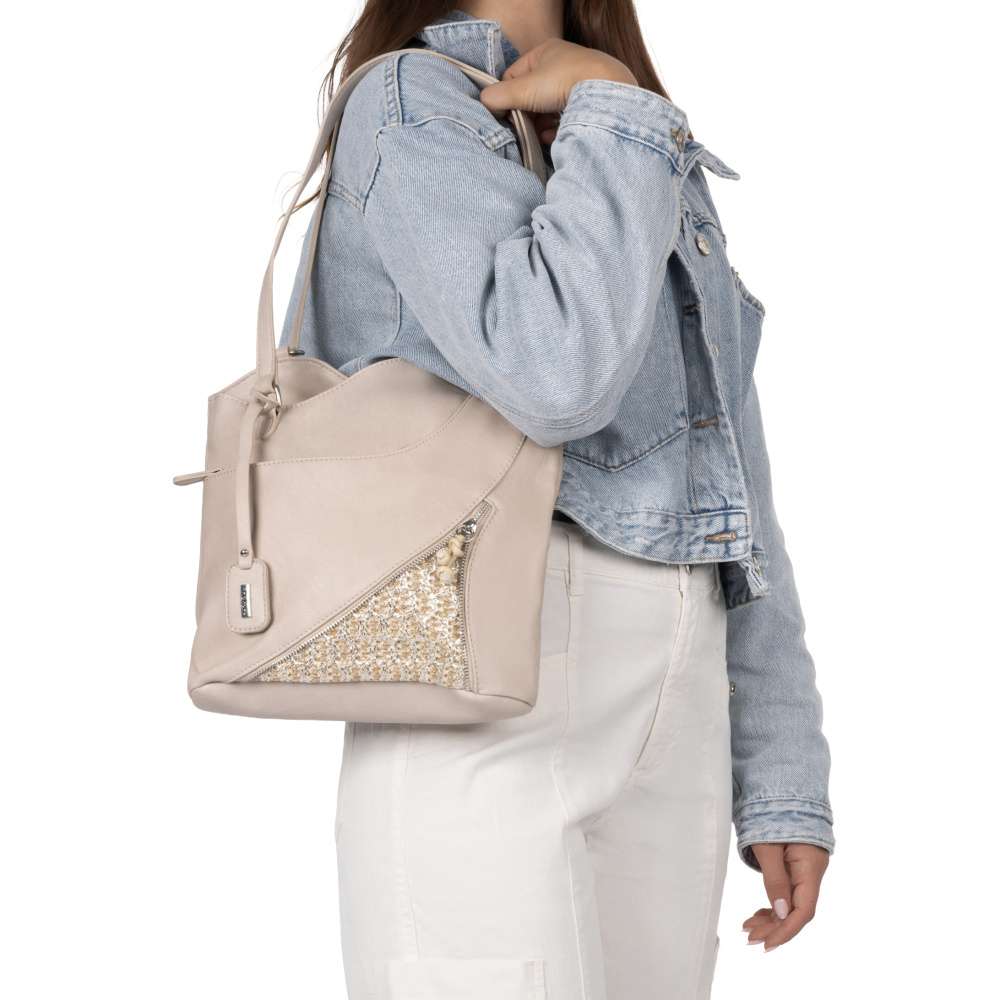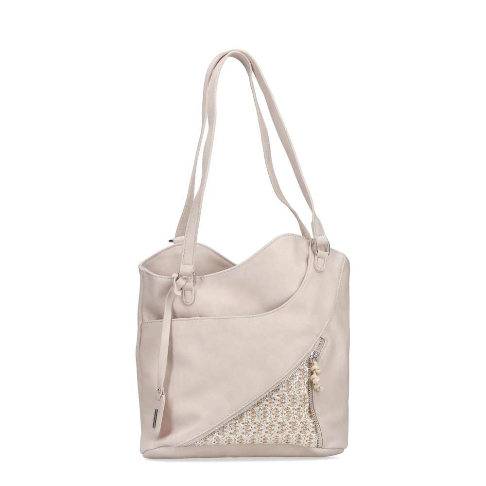 Tato skvostná kabelka značky RIEKER v béžovém provedení zaujme na první pohled díky efektní kombinaci hladkého materiálu a materiálu se strukturou, který dodává modelu stylový vzhled. Přední část doplňuje ozdobný zip, který slouží jako designový prvek a visačka s logem značky připevněná na popruhu dotvoří originalitu tohoto modelu. U horního okraje se nachází zip otevírající prostorný hlavní prostor s vnitřním dělením středovou kapsou, která usnadní organizaci, zatímco menší přihrádky jsou ideální pro odložení drobností. Menší zipová kapsička je umístěna také na zadní části. Kabelka je vybavena dvěma delšími popruhy, díky čemuž ji můžete pohodlně nosit přes rameno nebo zvolit variantu batohu. Tato kabelka RIEKER bude díky svému originálnímu vzhledu a funkčnímu řešení skvělým doplňkem, který dodá vašemu outfitu jedinečný styl pro každý den.
