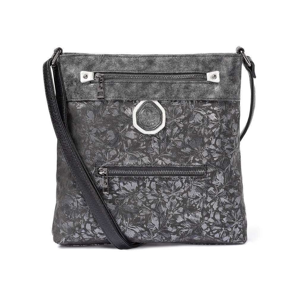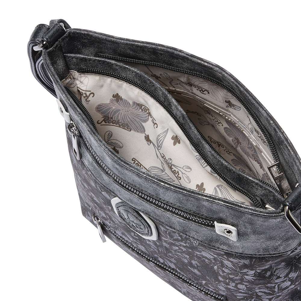Dámská kabelka Rieker je zdobná květinovou dekorací se stříbrnými odlesky a její vrchní část má metalickou barvu. Na přední straně jsou dvě malé funkční kapsičky a zdobné logo firmy Rieker, které je umístěné i na zdobném řemínku z boku kabelky. Kabelky Rieker nabízíme v naší kolekci k obuvi jako skvělý doplněk.