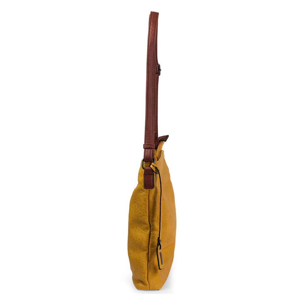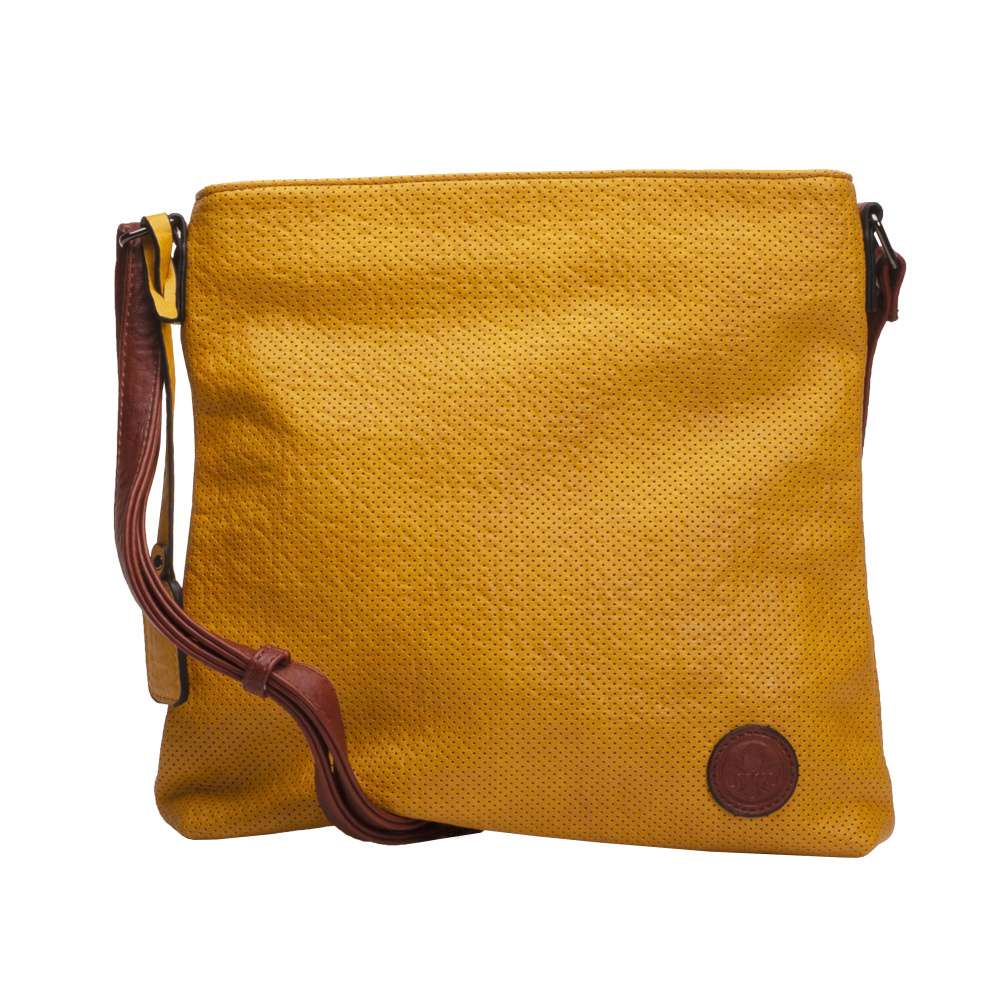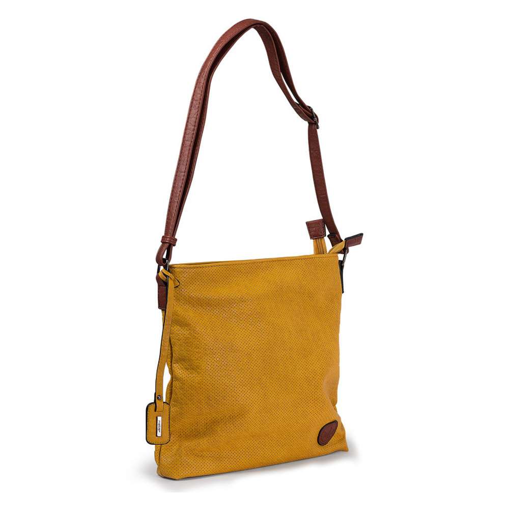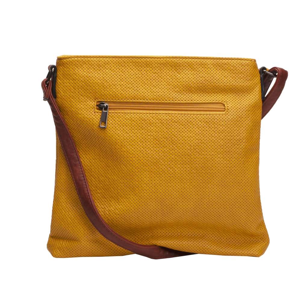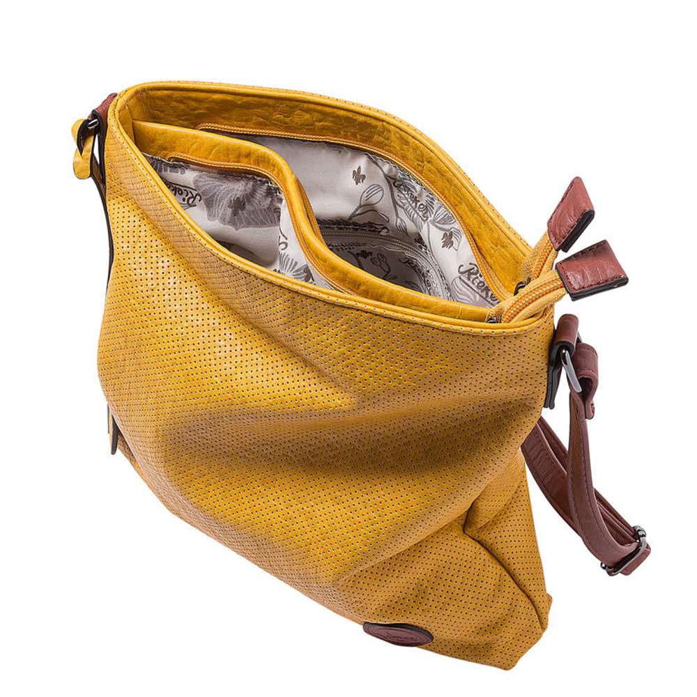 Taška je dělená na dvě části uzavíratelné zipem, kde uvnitř najdete kapsičky na drobnosti. Má dlouhý ramenní popruh v krásné hnědé barvě, který lze velikostně nastavit.