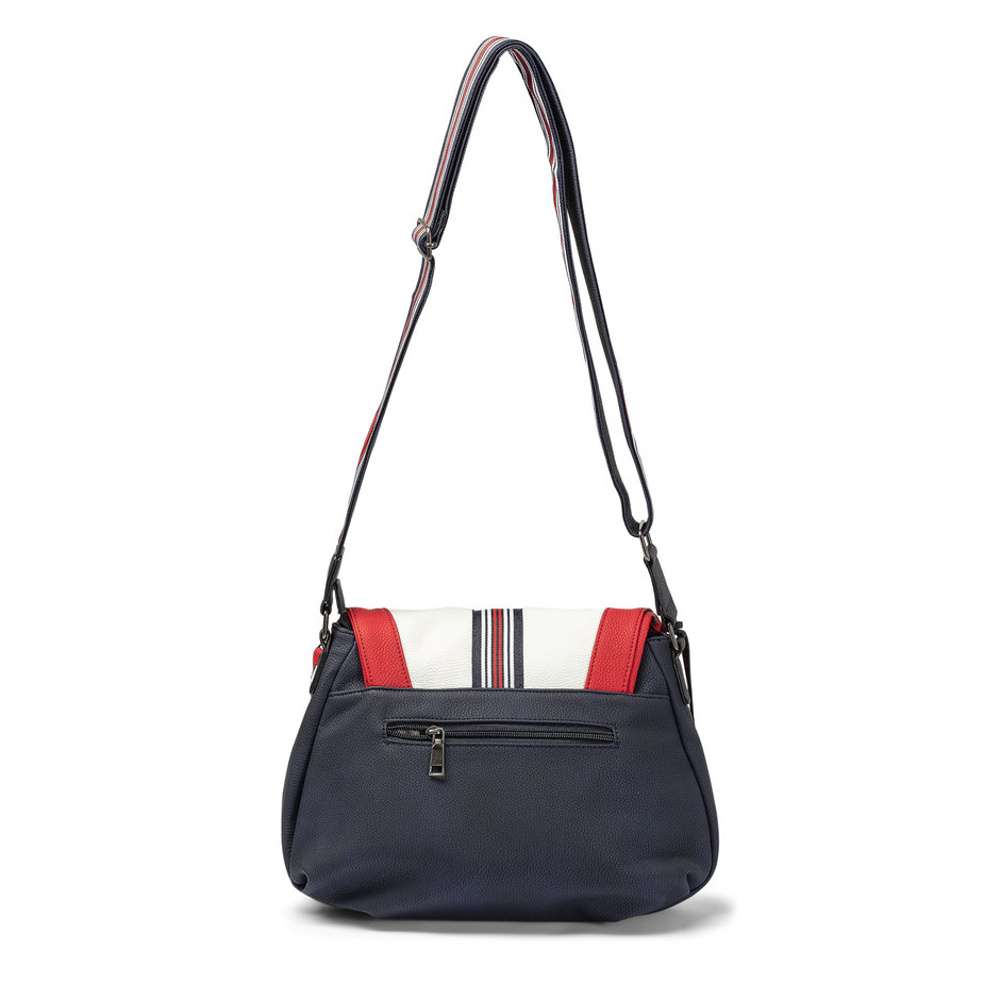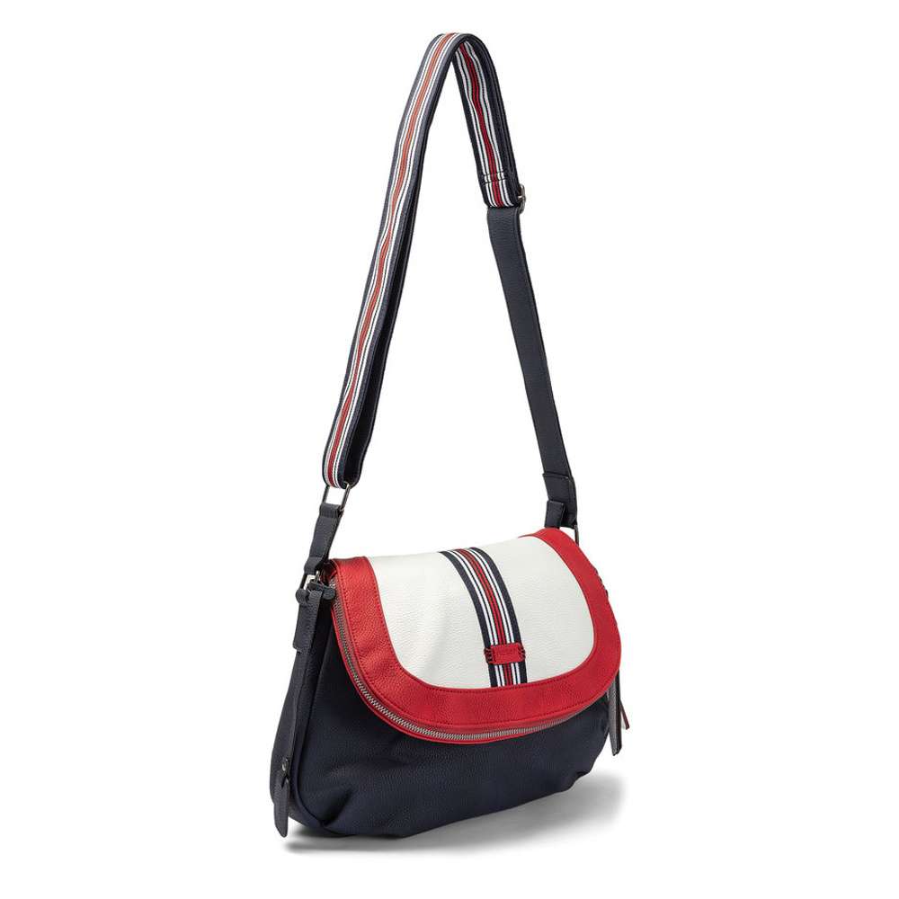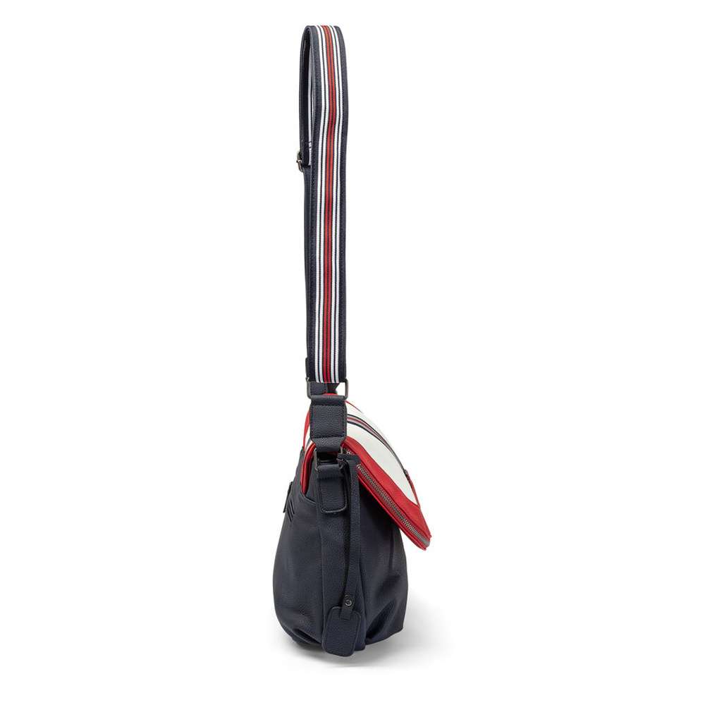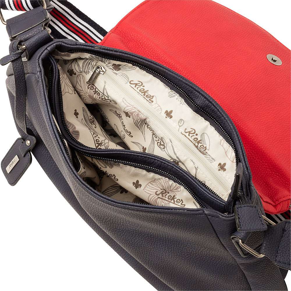 Do této nepřehlédnutelné kabelky značky RIEKER dáte snad vše, co potřebujete mít u sebe každý den. Tmavě modrý svršek je ozdoben kontrastními červenými a bílými částmi a proužky. Kabelka se uzavírá klopou na magnetický klip. Po jejím odklopení nalezneme dvě kapsy na zip, do kterých se vleze snad všechno, co potřebujete u sebe mít. Na zadní straně se nachází menší kapsa, která poslouží k uložení různých drobností. Taška má širší popruh ozdobený kontrastními pruhy a můžete si jej nastavit na Vámi zvolenou délku. Tento model využijete na procházky s přáteli nebo na cesty do práce. Rozměry: cca v 23 cm x š cca 31 cm Vnitřní uspořádání: kabelka je dělená. Kabelka má délkově nastavitelný popruh.