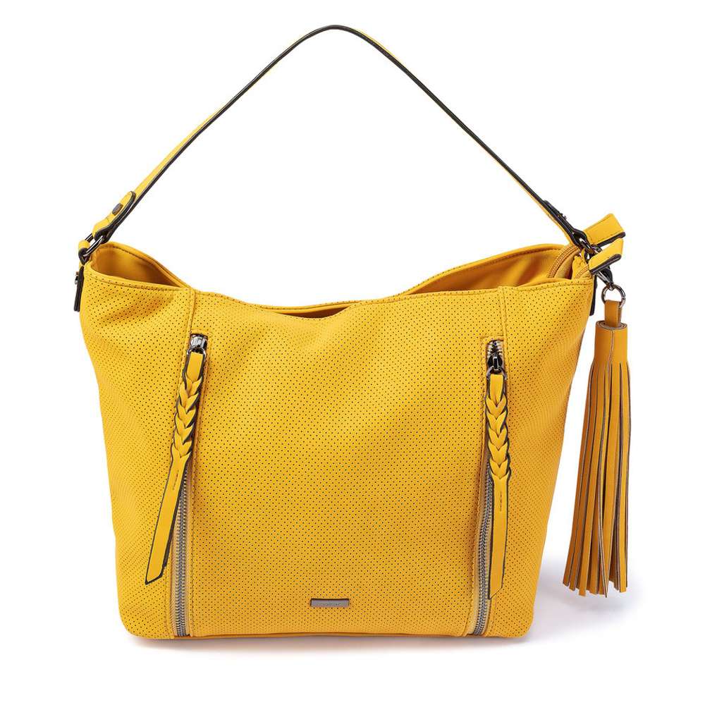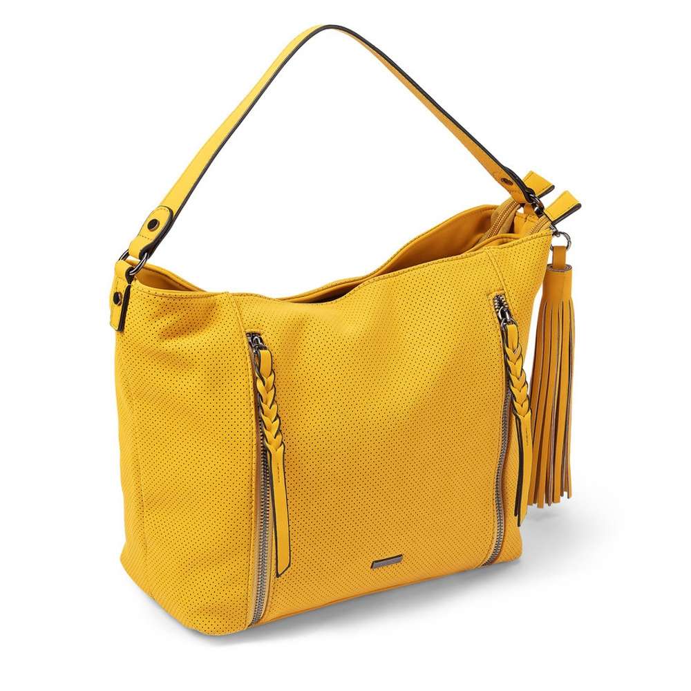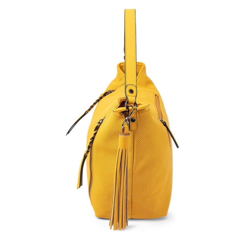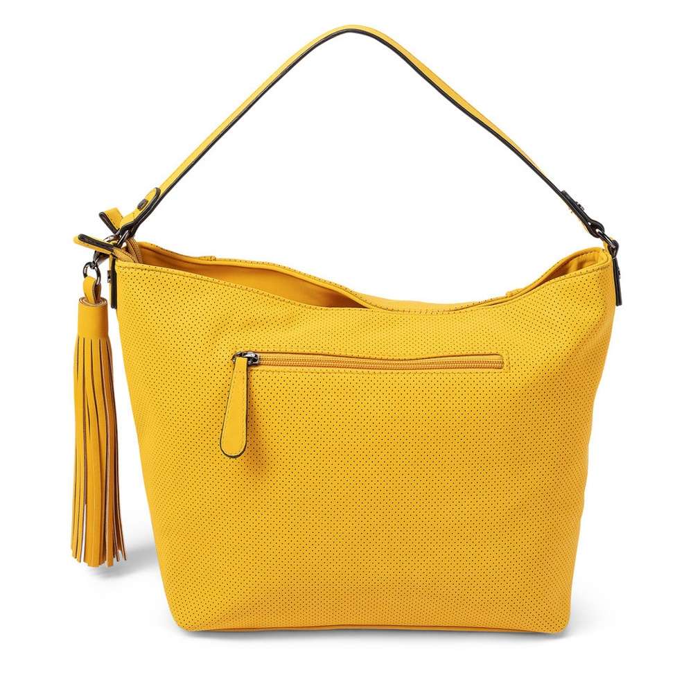 Jemně povrchově perforovaný svršek žluté barvy je na ozdoben zakončeními zipů, kovovým logem značky a třásňovým přívěškem.
