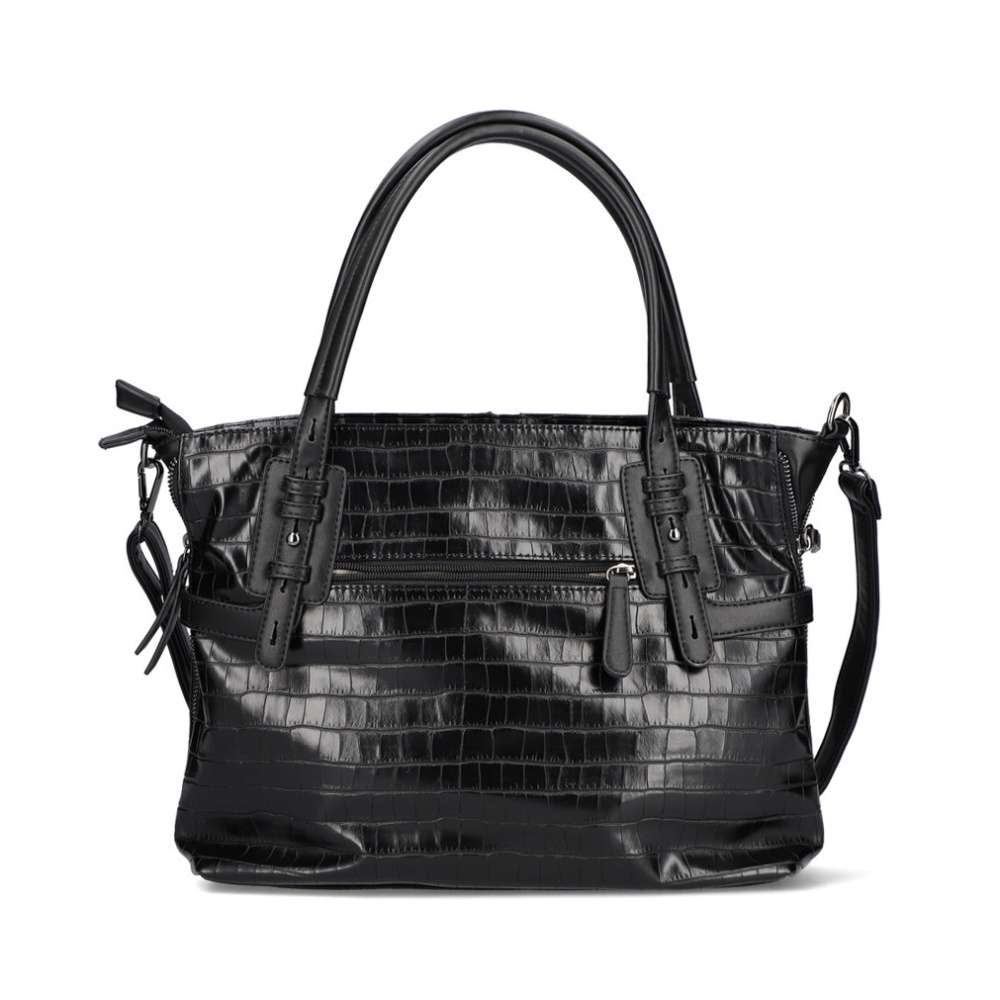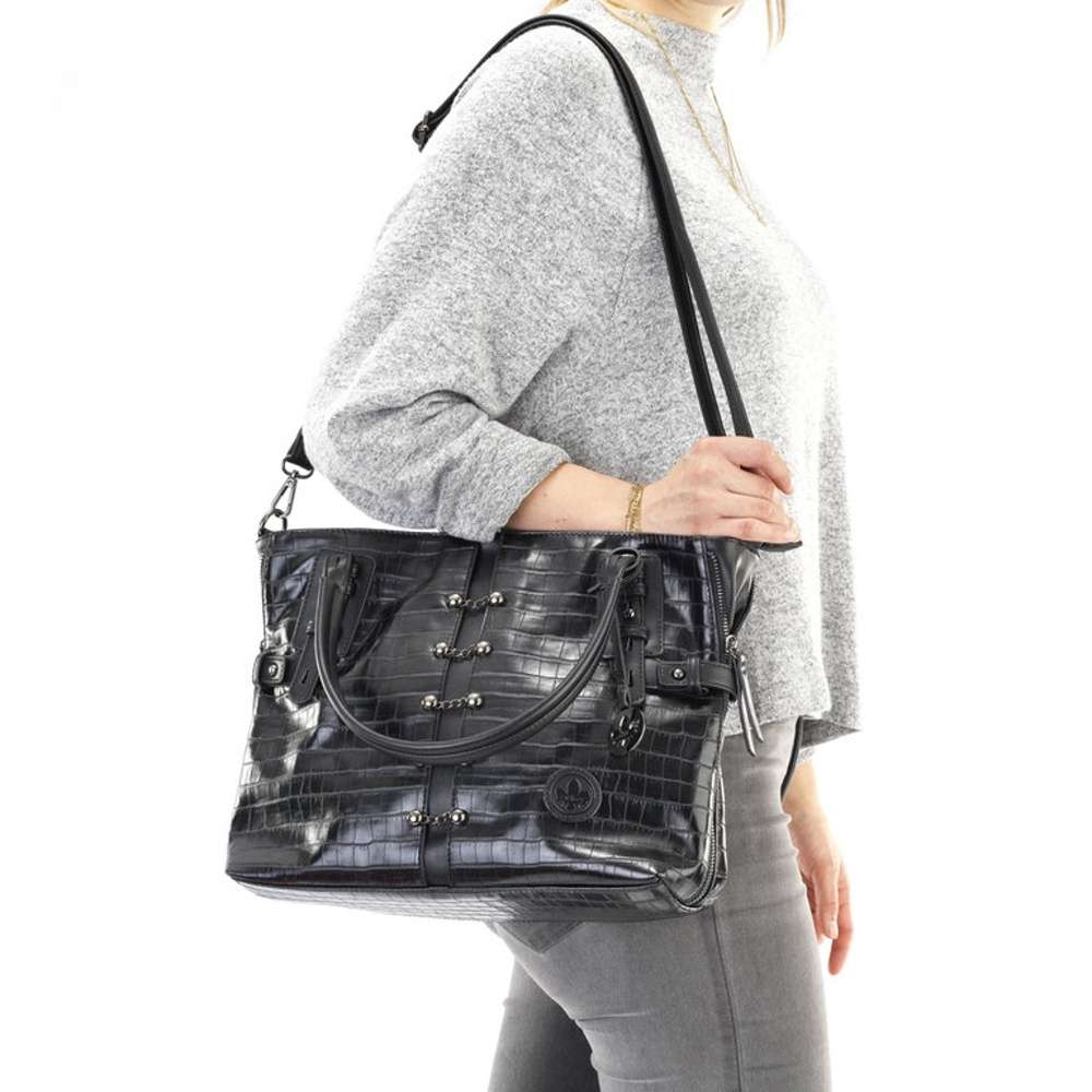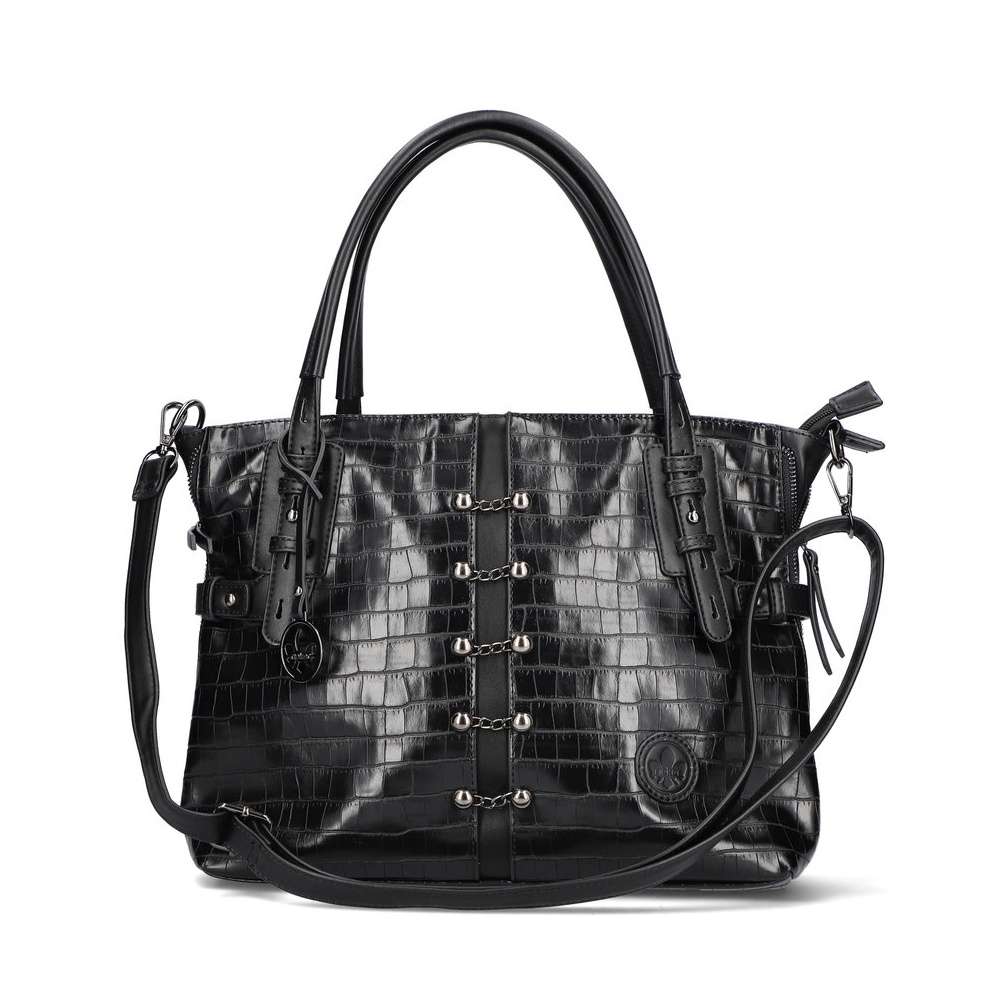 Černý lesklý svršek hadího vzoru je na přední straně ozdoben kovovými řetízky, vytlačeným logem značky a po stranách zipy, kterými můžete kabelku trošku zvětšit.